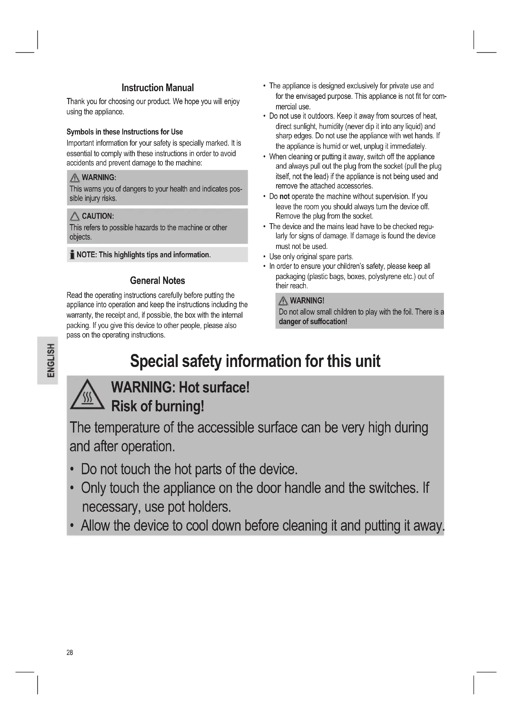 Do not allow small children to play with the foil. There is a danger of suffocation!