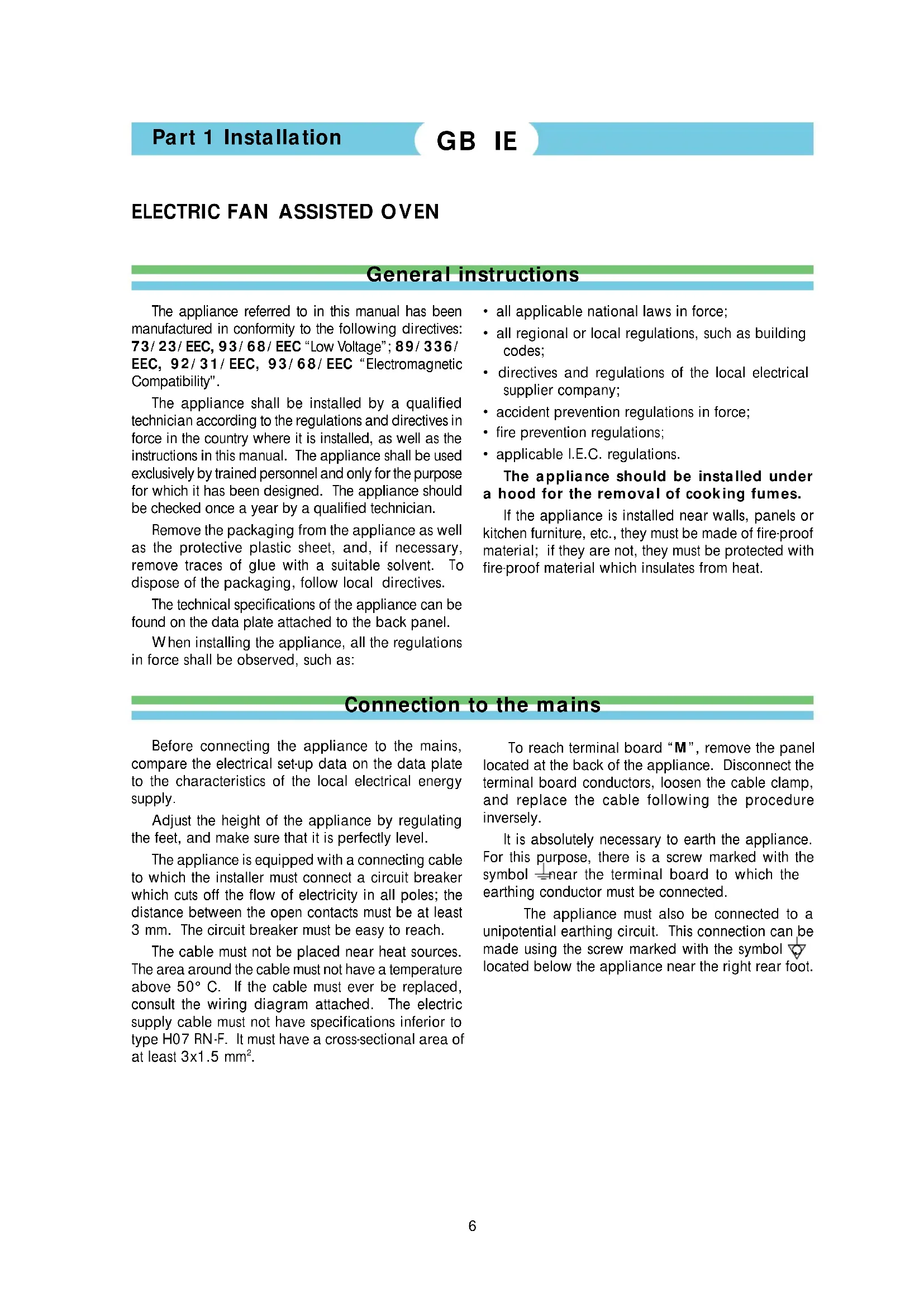 - applicable I.E.C. regulations. The appliance should be installed under a hood for the removal of cooking fumes. If the appliance is installed near walls, panels or kitchen furniture, etc., they must be made of fire-proof material; if they are not, they must be protected with fire-proof material which insulates from heat. GB IE7