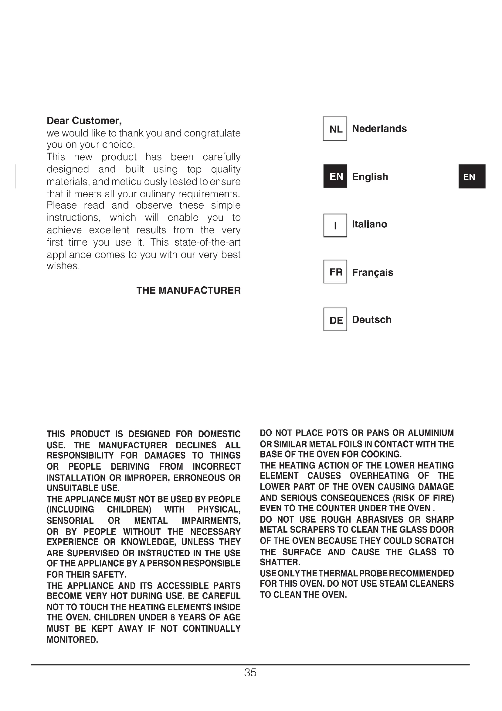 Dear Customer, we would like to thank you and congratulate you on your choice. This new product has been carefully designed and built using top quality materials, and meticulously tested to ensure that it meets all your culinary requirements. Please read and observe these simple instructions, which will enable you to achieve excellent results from the very first time you use it. This state-of-the-art appliance comes to you with our very best wishes. THE MANUFACTURER