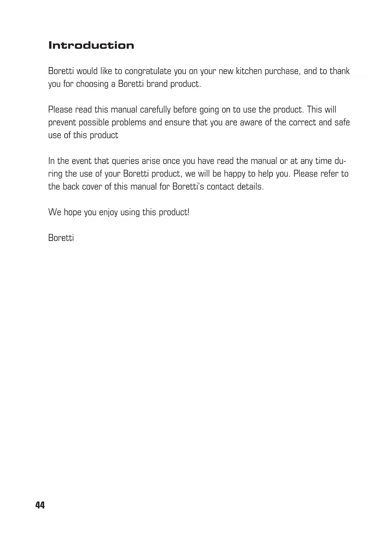 Before First Use Safety Instructions 34 Cleaning Before First Use 34 General Installation Instructions Installation and connection 35 Description of oven functions Overview 37 Digital timer 39 Maintenance 40 Environmental Regulations 41 Contents46 Before First Use Safety Instructions This manual is part of the range cooker. It must be kept nearby during the entire lifespan of the range cooker. We recommend reading this ma- nual carefully before using the range cooker. The range cooker must be installed by a quali- fied technician in compliance with installation instructions as described in the previous chap- ter. This range cooker is suitable for household use, and complies with current EU guidelines. The range cooker has been manufactured to cook and bake foods. Boretti is not liable for unau- thorized use of the appliance, such as heating up a space. Never block the openings and slots of your Boretti, so that proper ventilation is ensured. Check the appliance after unpacking the oven. If there are visible damages do not install and use the oven and contact Boretti immediately. Boretti can not be held liable for damages after installation of the appliance. Immediately after installation, the range coo- ker should be thoroughly tested, and any mal- functions reported. Always open or close the oven door using the handle. Also, before closing the door check if there are no objects in the oven which should not be left in the oven. Never place combustible products in your oven. Unexpected ignition could result in fire. The range cooker is designed for use by adults, never allow children to remain near the range cooker unsupervised. Certain parts such as the grill element can become extremely hot. Therefore do not allow children to play or be near the range cooker. After every use, verify that all control knobs are set to “off”. In case of doubt regarding the safety instruc- tions of your Boretti, we urgently recommend that you call Boretti. You will find our phone numbers on the back of this manual. Do not use parchment paper when grilling. Do not sit on the oven door or use it for support or as working table. Never put combustible objects or products that could melt at low temperatures in the storage space below the oven. The oven is equipped with a cooling fan which ensures that the outside cavity of the oven is as cool as possible. This fan blows air out of the front of the oven and will keep on doing this until the inside of the oven is efficiently cooled down, Cleaning Before First Use It is recommended to thoroughly remove all packaging residue from the range cooker, fol- lowed by cleaning according to the guidelines. Before first use of the oven, you should heat the oven at full power for 30 minutes. An un- pleasant scorching smell will develop during this initial heating. This is normal. We recommend that you ventilate the kitchen area thoroughly during initial heating.NL