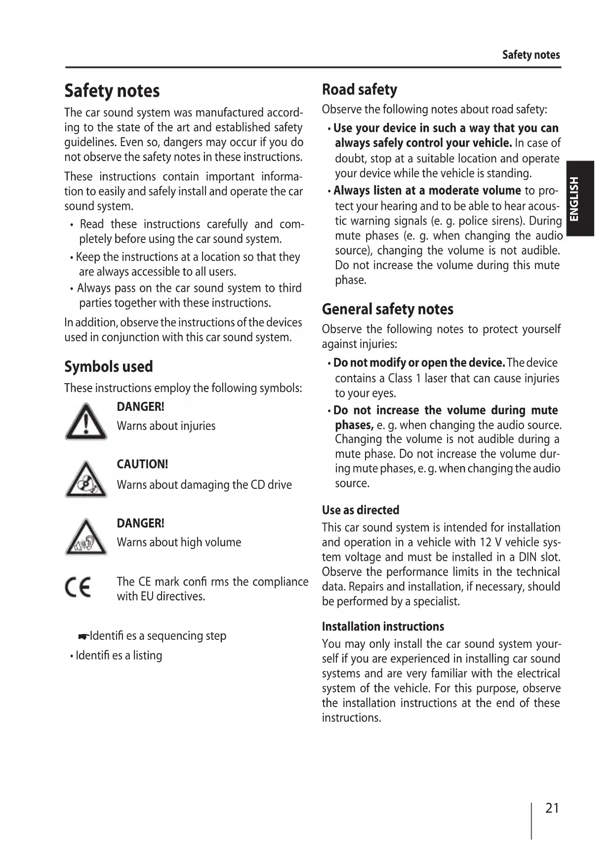 - Always pass on the car sound system to third parties together with these instructions. In addition, observe the instructions of the devices used in conjunction with this car sound system. Symbols used These instructions employ the following symbols: DANGER! Warns about injuries CAUTION! Warns about damaging the CD drive DANGER! Warns about high volume The CE mark con rms the compliance with EU directives. 쏅 Identi es a sequencing step