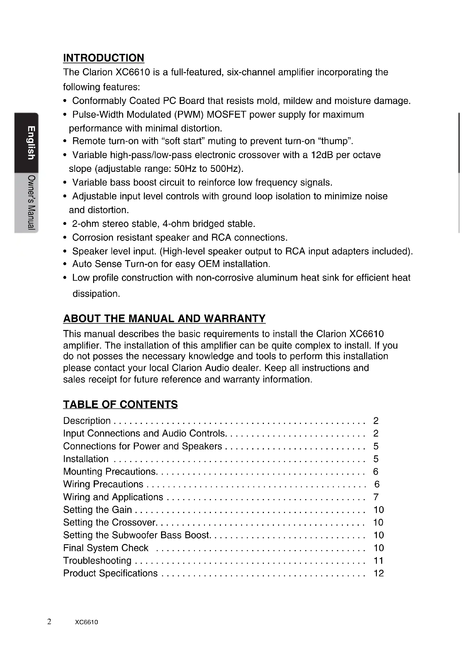 frequencies) without distortion. If you hear distortion, check the connections and verify that the Input Gain Control is set properly.XC6610 11 English Owner’s Manual TROUBLESHOOTING Problem No Audio. Amplifier not powering on. (LED turned off) Solution Remote turn-on voltage. Check remote connections at amplifier and source unit. Blown amplifier fuse. Replace with new fuse (same rating). Power wires not connected. Check power and ground wiring at amplifier and at battery. Speaker leads shorted. Check speaker continuity to ground, it should not show a common ground. Speakers not connected or are blown. Check speaker connections at amplifier, measure coil impedance. Problem Audio cycles on and off. Solution Thermal protection circuits are shutting amplifier off. Check location for adequate ventilation; consult an authorized Clarion Audio dealer. Problem Distorted audio. Solution Input Gain is not set properly, or damaged speaker cones. Review Setting Gain; inspect each speaker. (i.e. check connection, speaker impedance, etc.) Problem Audio lacks punch. Solution Speakers wired incorrectly, which causes cancellation of bass frequencies. Check polarity of wires from amplifier to each speaker as defined by the system design. Problem Amplifier fuse keeps blowing. Solution Incorrect wiring or short circuit. Review installation and check all wiring connections. Problem Whining or ticking noise in the audio with engine on. Solution Amplifier is picking up alternator noise or radiated noise. Lower input gain; move audio cables away from power wires. Check power and ground connections on amplifier; check alternator and/or voltage regulator; test for weak battery, check power and ground connections of battery.12 XC6610 English Owner’s Manual Frequency Response 20Hz ~ 20kHz Crossover Frequency (Low, High, Full) Variable 50Hz ~ 500Hz Low Level Input Sensitivity 200mV ~ 6.0V Max. Power Output 1000W RMS Power Output @4Ω 85W x 6 @1.0% THD RMS Power Output @2Ω 125W x 6 @1.0% THD RMS Bridged Power Output @250W x 3 @1.0% THD Fuse 40A x 2 Dimensions (W x H x D) 288mm x 55mm x 174mm 11-3/8in x 2-3/16in x 6-7/8in PRODUCT SPECIFICATIONS