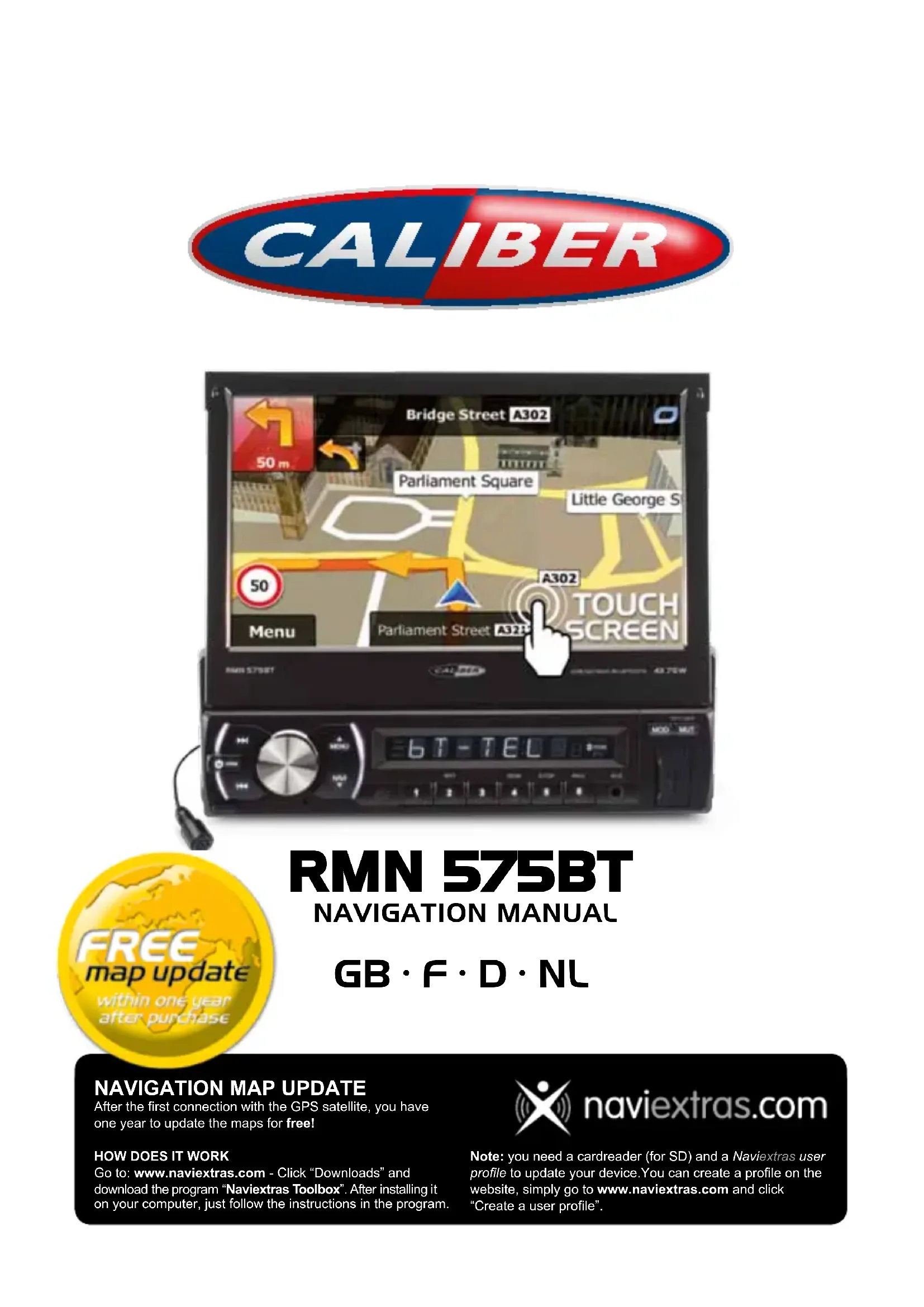 - Thank you for choosing the Caliber RMN575BT as your navigator. Start using Caliber RMN575BT right away. This document is the detailed description of the navigation software. You can easily discover Caliber while you are using it; however, we still recommend that you read this manual to fully understand the screens and features. 2RMN 575BT NavigatioN MaNual ENGLISH Table of contents 1 Warnings and Safety information p. 6