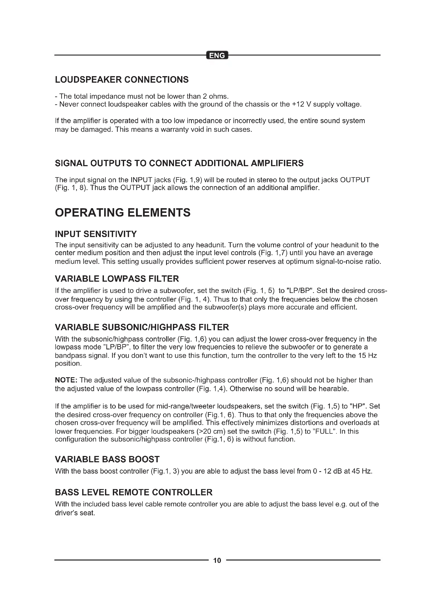 The input signal on the INPUT jacks (Fig. 1,9) will be routed in stereo to the output jacks OUTPUT (Fig. 1, 8). Thus the OUTPUT jack allows the connection of an additional amplifier. OPERATING ELEMENTS The input sensitivity can be adjusted to any headunit. Turn the volume control of your headunit to the center medium position and then adjust the input level controls (Fig. 1,7) until you have an average medium level. This setting usually provides sufficient power reserves at optimum signal-to-noise ratio. INPUT SENSITIVITY If the amplifier is used to drive a subwoofer, set the switch (Fig. 1, 5) to "LP/BP". Set the desired cross- over frequency by using the controller (Fig. 1, 4). Thus to that only the frequencies below the chosen cross-over frequency will be amplified and the subwoofer(s) plays more accurate and efficient.