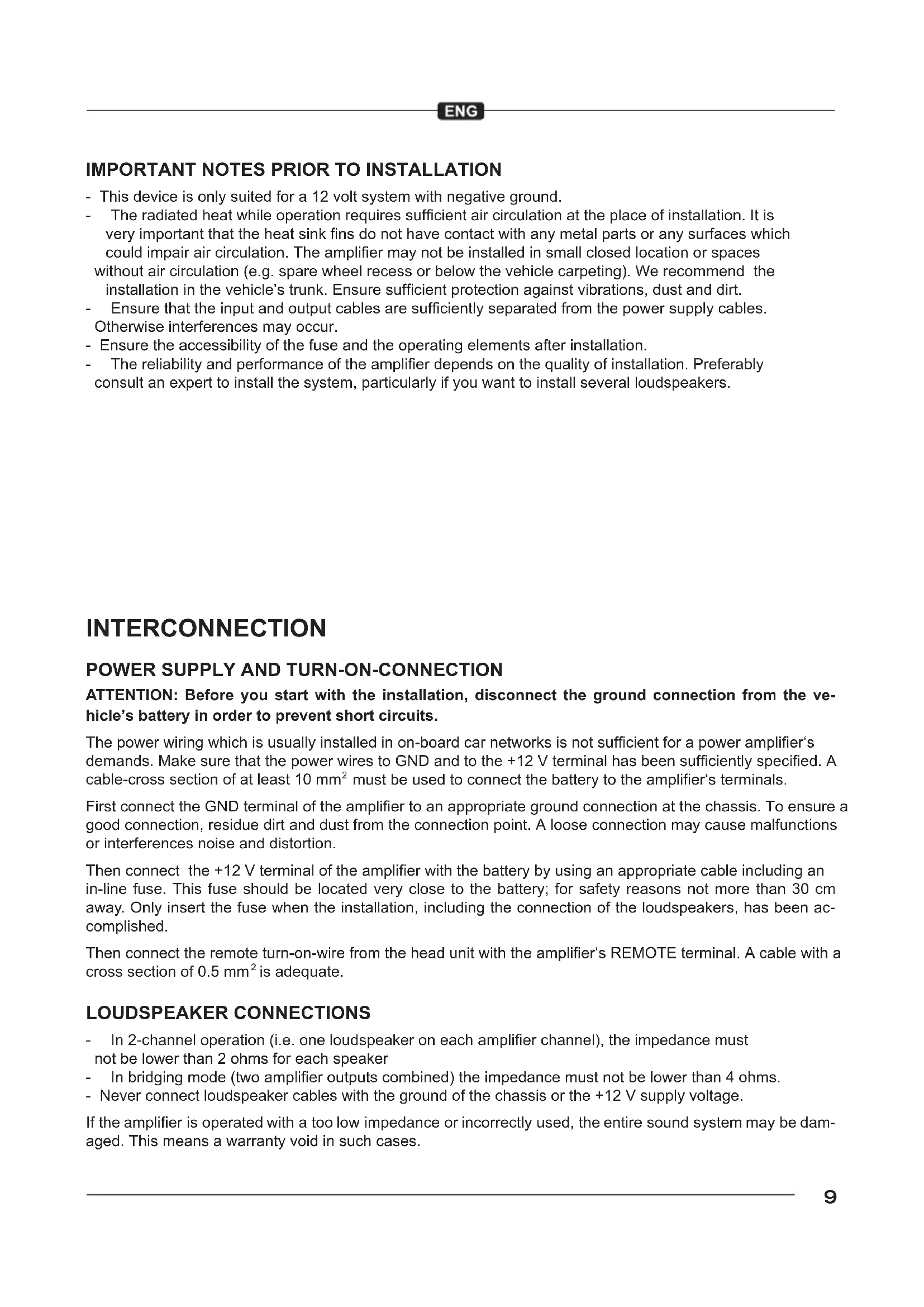 The power wiring which is usually installed in on-board car networks is not sufficient for a power amplifier's demands. Make sure that the power wires to GND and to the +12 V terminal has been sufficiently specified. A cable-cross section of at least 10 mm ^2 must be used to connect the battery to the amplifier's terminals.