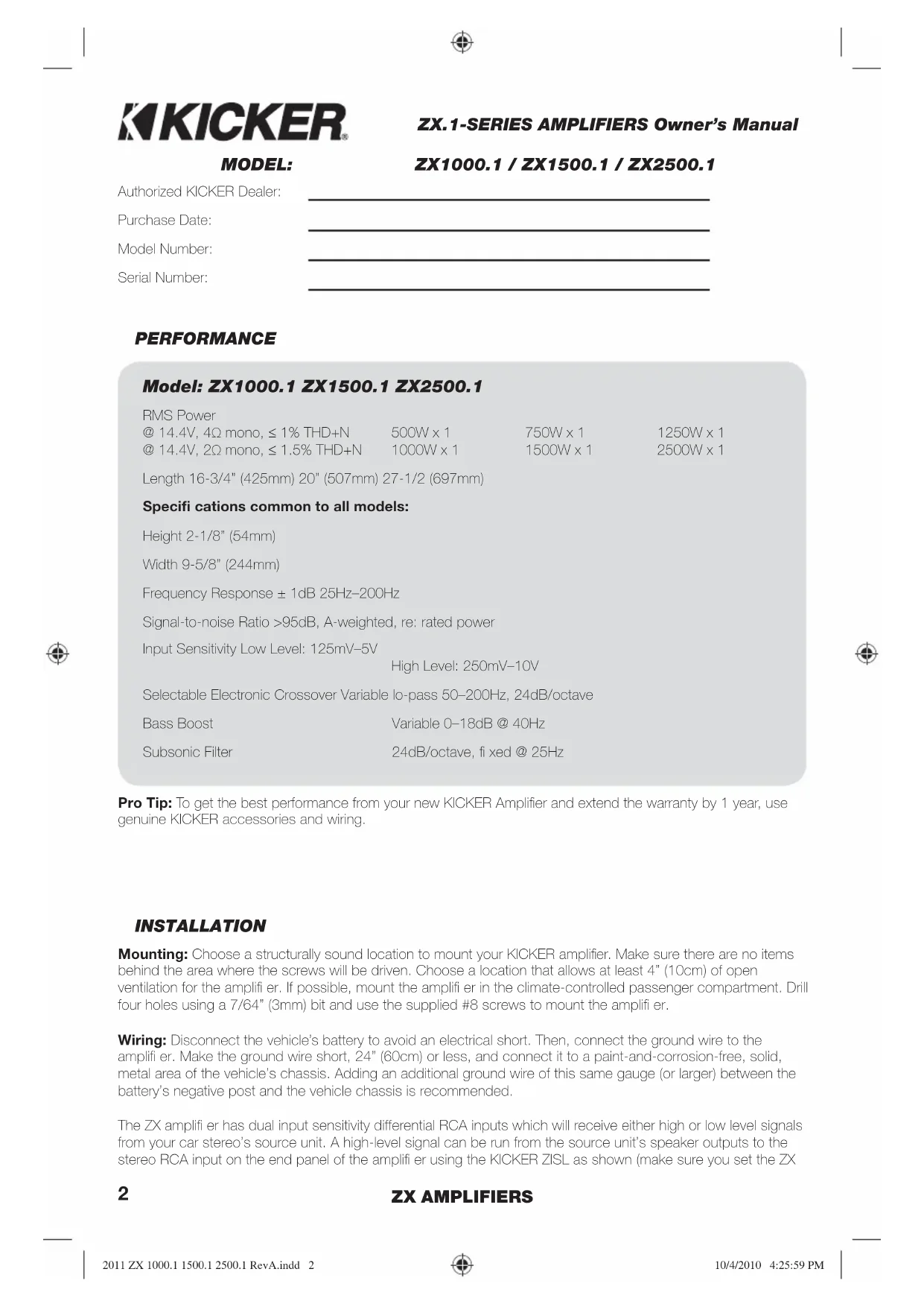 ZX AMPLIFIER ZX1000.1 ZX1500.1 ZX2500.1 English Version Versión Español Amplificador del la Serie ZX.1 Deutsche Version Stereoverstärker der ZX.1-Serie Version Francaise Amplificateur de série ZX.1 LIVIN’ LOUD 2011 ZX 1000.1 1500.1 2500.1 RevA.indd 12011 ZX 1000.1 1500.1 2500.1 RevA.indd 1 10/4/2010 4:25:53 PM10/4/2010 4:25:53 PM2 ZX AMPLIFIERS ZX.1-SERIES AMPLIFIERS Owner’s Manual INSTALLATION Mounting: Choose a structurally sound location to mount your KICKER amplifi er. Make sure there are no items behind the area where the screws will be driven. Choose a location that allows at least 4” (10cm) of open ventilation for the amplifi er. If possible, mount the amplifi er in the climate-controlled passenger compartment. Drill four holes using a 7/64” (3mm) bit and use the supplied #8 screws to mount the amplifi er. Wiring: Disconnect the vehicle’s battery to avoid an electrical short. Then, connect the ground wire to the amplifi er. Make the ground wire short, 24” (60cm) or less, and connect it to a paint-and-corrosion-free, solid, metal area of the vehicle’s chassis. Adding an additional ground wire of this same gauge (or larger) between the battery’s negative post and the vehicle chassis is recommended. The ZX amplifi er has dual input sensitivity differential RCA inputs which will receive either high or low level signals from your car stereo’s source unit. A high-level signal can be run from the source unit’s speaker outputs to the stereo RCA input on the end panel of the amplifi er using the KICKER ZISL as shown (make sure you set the ZX PERFORMANCE Authorized KICKER Dealer: Purchase Date: Model Number: Serial Number: Model: ZX1000.1 ZX1500.1 ZX2500.1 RMS Power @ 14.4V, 4Ω mono, 1% THD+N @ 14.4V, 2Ω mono, 1.5% THD+N 500W x 1 1000W x 1 750W x 1 1500W x 1 1250W x 1 2500W x 1 Length 16-3/4” (425mm) 20” (507mm) 27-1/2 (697mm) Specifi cations common to all models: Height 2-1/8” (54mm) Width 9-5/8” (244mm) Frequency Response ± 1dB 25Hz–200Hz Signal-to-noise Ratio >95dB, A-weighted, re: rated power Input Sensitivity Low Level: 125mV–5V High Level: 250mV–10V Selectable Electronic Crossover Variable lo-pass 50–200Hz, 24dB/octave Bass Boost Variable 0–18dB @ 40Hz Subsonic Filter 24dB/octave, fi xed @ 25Hz Pro Tip: To get the best performance from your new KICKER Amplifi er and extend the warranty by 1 year, use genuine KICKER accessories and wiring.