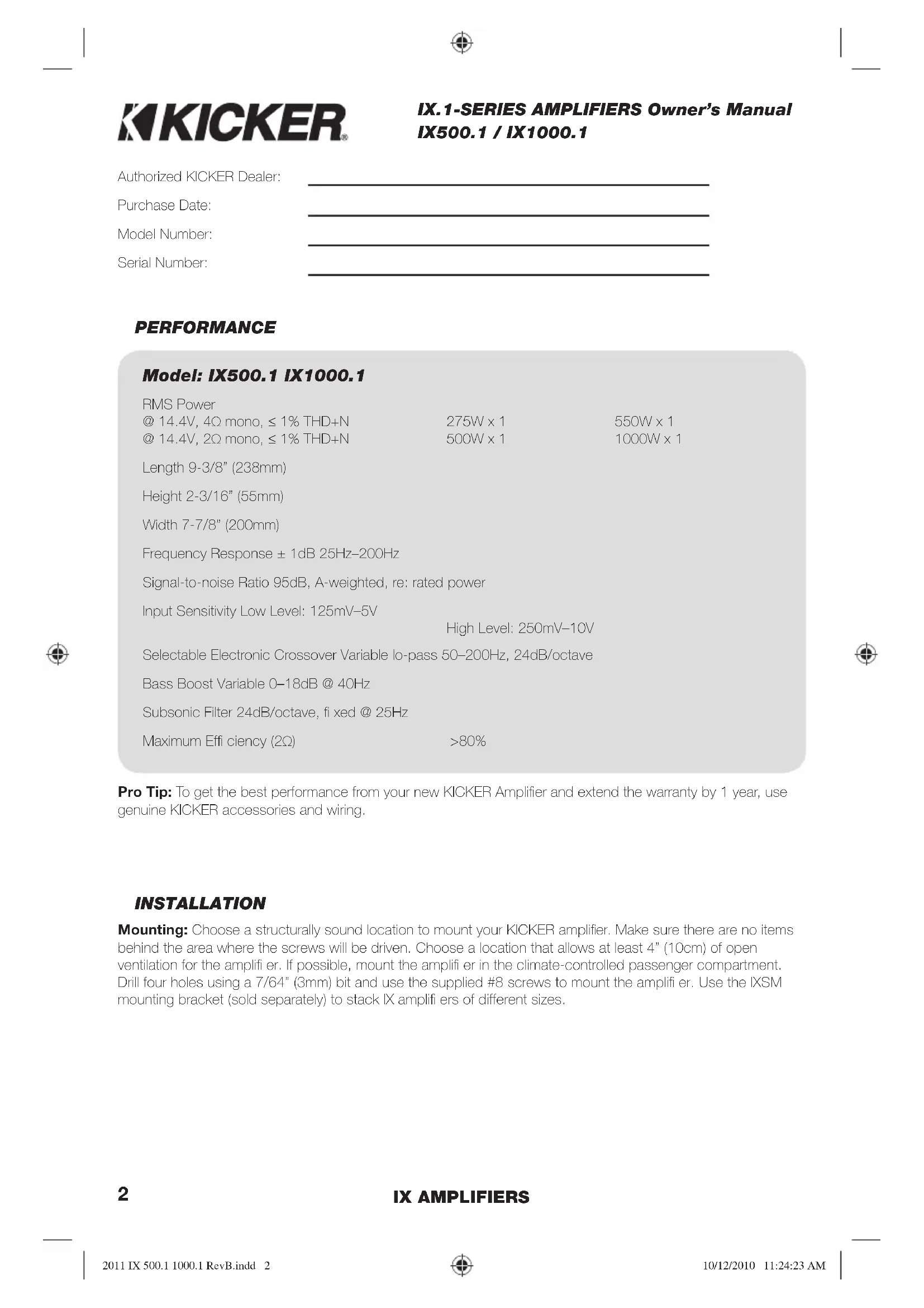 IX AMPLIFIER IX500.1 IX1000.1 English Version Versión Español Amplificador del la Serie IX.1 Deutsche Version Stereoverstärker der IX.1-Serie Version Francaise Amplificateur de série IX.1 LIVIN’ LOUD 2011 IX 500.1 1000.1 RevB.indd 12011 IX 500.1 1000.1 RevB.indd 1 10/12/2010 11:24:17 AM10/12/2010 11:24:17 AM2 IX AMPLIFIERS IX.1-SERIES AMPLIFIERS Owner’s Manual INSTALLATION Mounting: Choose a structurally sound location to mount your KICKER amplifi er. Make sure there are no items behind the area where the screws will be driven. Choose a location that allows at least 4” (10cm) of open ventilation for the amplifi er. If possible, mount the amplifi er in the climate-controlled passenger compartment. Drill four holes using a 7/64” (3mm) bit and use the supplied #8 screws to mount the amplifi er. Use the IXSM mounting bracket (sold separately) to stack IX amplifi ers of different sizes. PERFORMANCE Authorized KICKER Dealer: Purchase Date: Model Number: Serial Number: Model: IX500.1 IX1000.1 RMS Power @ 14.4V, 4Ω mono, 1% THD+N @ 14.4V, 2Ω mono, 1% THD+N 275W x 1 500W x 1 550W x 1 1000W x 1 Length 9-3/8” (238mm) Height 2-3/16” (55mm) Width 7-7/8” (200mm) Frequency Response ± 1dB 25Hz–200Hz Signal-to-noise Ratio 95dB, A-weighted, re: rated power Input Sensitivity Low Level: 125mV–5V High Level: 250mV–10V Selectable Electronic Crossover Variable lo-pass 50–200Hz, 24dB/octave Bass Boost Variable 0–18dB @ 40Hz Subsonic Filter 24dB/octave, fi xed @ 25Hz Maximum Effi ciency (2Ω) >80% Pro Tip: To get the best performance from your new KICKER Amplifi er and extend the warranty by 1 year, use genuine KICKER accessories and wiring. IX500.1 / IX1000.1 2011 IX 500.1 1000.1 RevB.indd 22011 IX 500.1 1000.1 RevB.indd 2 10/12/2010 11:24:23 AM10/12/2010 11:24:23 AM3 Model External Fuse (sold separately) Power/Ground Wire KICKER Wiring Kit IX500.1 1 x 50 Ampere 4 Gauge PK4, CK4, ZCK4 IX1000.1 1 x 100 Ampere 4 Gauge PK4, CK4, ZCK4 Wiring: Disconnect the vehicle’s battery to avoid an electrical short. Then, connect the ground wire to the amplifi er. Make the ground wire short, 24” (60cm) or less, and connect it to a paint-and-corrosion-free, solid, metal area of the vehicle’s chassis. Adding an additional ground wire of this same gauge (or larger) between the battery’s negative post and the vehicle chassis is recommended. The IX amplifi er has dual input sensitivity differential RCA inputs which will receive either high or low level signals from your car stereo’s source unit. A high-level signal can be run from the source unit’s speaker outputs to the stereo RCA input on the end panel of the amplifi er using the KICKER ZISL as shown (make sure you set the IX amplifi er’s input level switch to “HI”). Alternatively, the signal can be delivered to the amplifi er using the low-level RCA outputs on the source unit. Set the input level switch on the end panel of the amplifi er to “LO”. Either input method will provide a low-level output signal at the RCA output, which effectively passes the audio signal to another amplifi er or component. Keep the audio signal cable away from factory wiring harnesses and other power wiring. If you need to cross this wiring, cross it at a 90 degree angle. source unit high-level speaker outputs to amplifi er shield