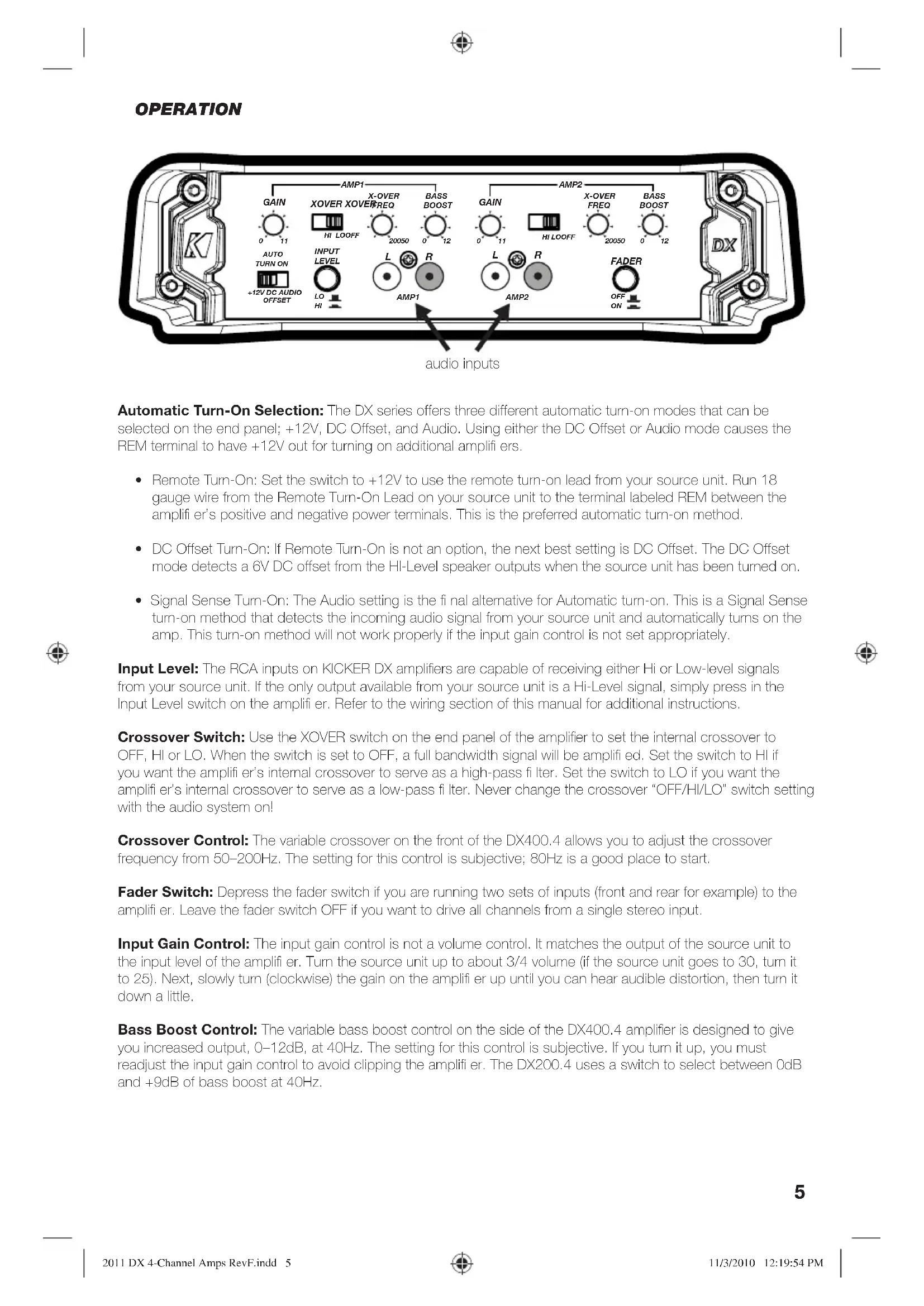 - Signal Sense Turn-On: The Audio setting is the fi nal alternative for Automatic turn-on. This is a Signal Sense turn-on method that detects the incoming audio signal from your source unit and automatically turns on the amp. This turn-on method will not work properly if the input gain control is not set appropriately. Input Level: The RCA inputs on KICKER DX amplifi ers are capable of receiving either Hi or Low-level signals from your source unit. If the only output available from your source unit is a Hi-Level signal, simply press in the Input Level switch on the amplifi er. Refer to the wiring section of this manual for additional instructions. Crossover Switch: Use the XOVER switch on the end panel of the amplifi er to set the internal crossover to OFF, HI or LO. When the switch is set to OFF, a full bandwidth signal will be amplifi ed. Set the switch to HI if you want the amplifi er’s internal crossover to serve as a high-pass fi lter. Set the switch to LO if you want the amplifi er’s internal crossover to serve as a low-pass fi lter. Never change the crossover “OFF/HI/LO” switch setting with the audio system on! Crossover Control: The variable crossover on the front of the DX400.4 allows you to adjust the crossover frequency from 50–200Hz. The setting for this control is subjective; 80Hz is a good place to start. Fader Switch: Depress the fader switch if you are running two sets of inputs (front and rear for example) to the amplifi er. Leave the fader switch OFF if you want to drive all channels from a single stereo input. Input Gain Control: The input gain control is not a volume control. It matches the output of the source unit to the input level of the amplifi er. Turn the source unit up to about 3/4 volume (if the source unit goes to 30, turn it to 25). Next, slowly turn (clockwise) the gain on the amplifi er up until you can hear audible distortion, then turn it down a little. Bass Boost Control: The variable bass boost control on the side of the DX400.4 amplifi er is designed to give you increased output, 0–12dB, at 40Hz. The setting for this control is subjective. If you turn it up, you must readjust the input gain control to avoid clipping the amplifi er. The DX200.4 uses a switch to select between 0dB and +9dB of bass boost at 40Hz. 2011 DX 4-Channel Amps RevF.indd 52011 DX 4-Channel Amps RevF.indd 5 11/3/2010 12:19:54 PM11/3/2010 12:19:54 PM6 TROUBLESHOOTING If your amplifi er does not appear to be working, check the obvious things fi rst such as blown fuses, poor or incorrect wiring connections, incorrect setting of crossover switch and gain controls, etc. There is a Power Protection LED on the side power panel of your Kicker DX series amplifi er. Depending on the state of the amplifi er and the vehicle’s charging system, the LED will glow either Red or Green. When the green LED is lit this indicates the amplifi er is turned on and no trouble exists. Green LED off, no output? With a Volt Ohm Meter (VOM) check the following:
