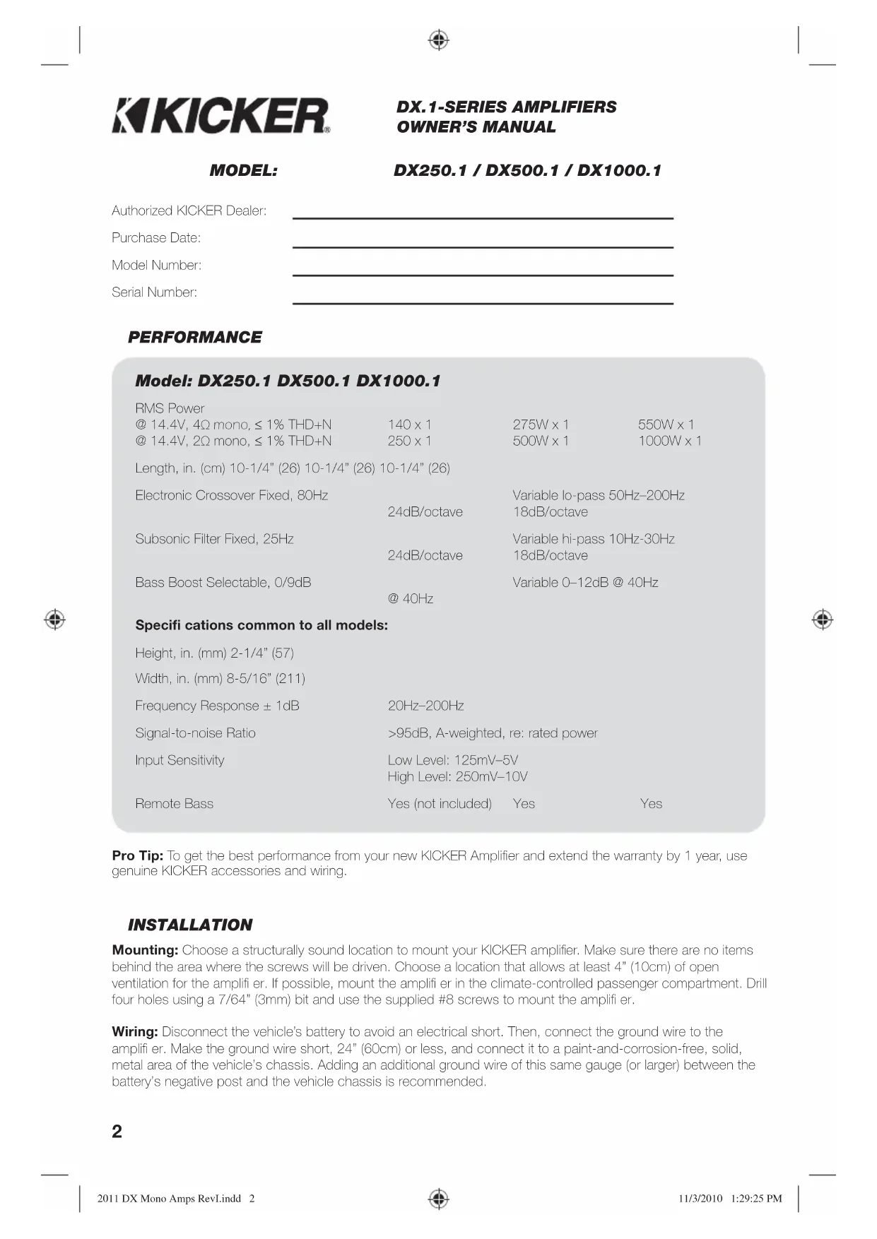 Check the gain settings and turn them down if they are set too high. Reduced bass response? Reverse a speaker connection from positive to negative on the stereo/subwoofer channel(s); if the bass improves, the speaker was out of phase. Ground Noise? KICKER amplifi ers are engineered to be fully compatible with all manufacturers’ head units. Some head units may require additional grounding to prevent noise from entering the audio signal. If you are experiencing this problem with your head unit, in most cases running a ground wire from the RCA outputs on the head unit to the chassis will remedy this issue. 2011 DX Mono Amps RevI.indd 52011 DX Mono Amps RevI.indd 5 11/3/2010 1:29:26 PM11/3/2010 1:29:26 PM6 KICKER will now provide a three- year warranty with all DX-Series Amplifi er purchases paired with a qualifying KICKER Installation Kit* . This extends the standard warranty by an additional year. Amplifi er and Kit must be purchased from an Authorized KICKER Dealer. KICKER DX amplifi er success is currently at an unheard-of rate, making the extended warranty program even more benefi cial to you. Using poor-quality, under-spec wiring kits will impede DX amplifi er performance. A superior-quality KICKER installation Kit is guaranteed to extend the life of DX amplifi ers. The new extended warranty applies only to KICKER amplifi ers and accessories sold to consumers by Authorized KICKER Dealers in the United States of America or its possessions. It also only applies to the original purchaser of KICKER amplifi ers and accessories. One warranty extension per amplifi er is allowed regardless of the number of amplifi er installation kits purchased. This program does not apply to “B”-stock product or factory-refurbished product. This offer is for a limited time, so see your local Authorized KICKER Dealer soon for details. *U.S.A. Only | EE.UU. solamente | Nur USA | Les USA Seulement DX250.1 140 x 1 @ 4 ohms, 14.4VDC, 1% THD, CEA-2006 (Watts) Signal to Noise Ratio -75dB CEA-2006 (ref: 1W, A-weighted) DX500.1 275 x 1 @ 4 ohms, 14.4VDC, 1% THD, CEA-2006 (Watts) Signal to Noise Ratio -75dB CEA-2006 (ref: 1W, A-weighted) DX1000.1 550 x 1 @ 4 ohm, 14.4VDC, 1% THD, CEA-2006 (Watts) Signal to Noise Ratio -75dB CEA-2006 (ref: 1W, A-weighted) Please Note: Modern high performance speakers have a lower DC Resistance than what used to be available. The KICKER Coaxial and Component speakers are rated at four ohms (some DC Resistances may be as low as 3 ohms) and work with any amplifi er designed to operate at a four ohm load. If you want to use two KICKER Coaxial or Component speakers on a single channel of your amplifi er, wire the speakers in series. This will improve the sound quality, lower the total harmonic distortion and lessen the thermal load at the amplifi er. This may prevent an amplifi er from shutting down due to over-current protection circuitry. CAUTION: When jump starting the vehicle, be sure that connections made with jumper cables are correct. Improper connections can result in blown amplifi er fuses as well as the failure of other critical systems in the vehicle. If you have more questions about the installation or operation of your new KICKER product, see the Authorized KICKER Dealer where you made your purchase. For more advice on installation, click on the SUPPORT tab on the KICKER homepage, www.kicker.com. Choose the TECHNICAL SUPPORT tab, choose the subject you are interested in, and then download or view the corresponding information. Please E-mail support@kicker.com or call Technical Services (405) 624-8583 for unanswered or specifi c questions. 2011 DX Mono Amps RevI.indd 62011 DX Mono Amps RevI.indd 6 11/3/2010 1:29:27 PM11/3/2010 1:29:27 PM7 Modelo: DX250.1 DX500.1 DX1000.1 Potencia RMS @ 14.4V, 4Ω monofónico, 1% THD+N @ 14.4V, 2Ω monofónico, 1% THD+N 140 x 1 250 x 1 275W x 1 500W x 1 550W x 1 1000W x 1 Largo, in. (cm) 10-1/4” (26) 10-1/4” (26) 10-1/4” (26) Crossover electrónico Fijo, 80Hz 24dB/octave Pasabajas variable de 50Hz–200Hz 18dB/octava Filtro Subsónico Fijo, 25Hz 24dB/octava Pasaalto variable de 10Hz-30Hz 18dB/octava Refuerzo de Bajos Seleccionable 0–9dB @ 40Hz Variable 0–12dB @ 40Hz Especifi caciones comunes de todos los modelos: Altura, in. (mm) 2-1/4” (57) Ancho, in (mm) 8-5/16” (211) Respuesta de frecuencias ± 1dB 20Hz–200Hz Relación de señal a ruido >95dB, ponderado en A, ref: potencia nominal Sensibilidad de entrada Baja Nivel: 125mV–5V Alto Nivel: 250mV–10V Remoto Bajo Si (vende por separado)Si Si