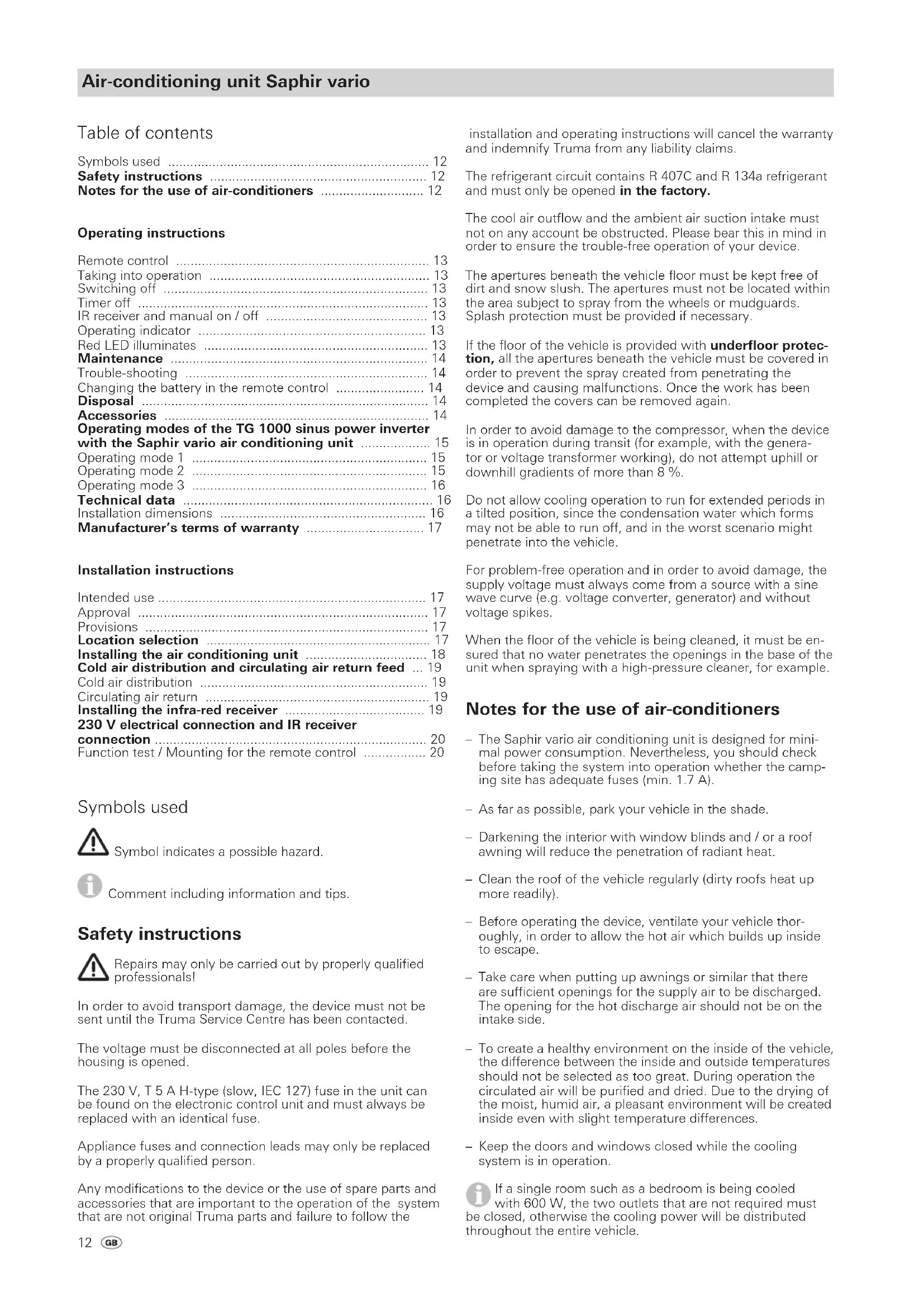 Netzkabel-Stecker (15) in die Steckerbuchse einstecken. Stecker wird automatisch durch Einrasten einer Haltenase zugentlastet. Zum Abziehen des Steckers muss die Haltenase mit einem Schraubendreher angehoben werden. Den Stecker für IR-Empfänger in die Steckerbuchse (16) einstecken. Der Anschluss (17) wird benötigt, wenn das Klima- gerät Saphir vario über einen Wechselrichter Truma TG 1000 sinus betrieben wird (Com-Anschluss / Kommunika- tion a oder b). Elektronikdeckel wieder schließen und die Schrauben (14) wieder festschrauben. Die Kabel müssen so viel Spiel haben, dass das Gerät mit angeschlossenen Kabeln aus dem Zwischenboden herausge- zogen werden kann. Alle Kabel müssen mit Schellen gesichert werden! Für Wartungs- bzw. Reparaturarbeiten muss fahrzeugseitig eine Trennvorrichtung zur allpoligen Trennung vom Netz mit mindestens 3,5 mm Kontaktabstand vorhanden sein. Funktionsprüfung / Halterung für die Fernbedienung Die Halterung für die Fernbedienung möglichst in der Nähe des Empfängers (9) positionieren, um den Betrieb des Klimagerätes zu ermöglichen, ohne die Fernbedienung aus der Halterung zu entnehmen. Abschließend müssen gemäß der Ge brauchsanweisung sämt- liche Funktionen des Gerätes geprüft werden. Die Gebrauchsanweisung ist dem Fahrzeughalter auszuhändigen.12 Air-conditioning unit Saphir vario Symbols used Symbol indicates a possible hazard. Comment including information and tips. Safety instructions Repairs may only be carried out by properly qualified professionals! In order to avoid transport damage, the device must not be sent until the Truma Service Centre has been contacted. The voltage must be disconnected at all poles before the housing is opened. The 230 V, T 5 A H-type (slow, IEC 127) fuse in the unit can be found on the electronic control unit and must always be replaced with an identical fuse. Appliance fuses and connection leads may only be replaced by a properly qualified person. Any modifications to the device or the use of spare parts and accessories that are important to the operation of the system that are not original Truma parts and failure to follow the installation and operating instructions will cancel the warranty and indemnify Truma from any liability claims. The refrigerant circuit contains R 407C and R 134a refrigerant and must only be opened in the factory. The cool air outflow and the ambient air suction intake must not on any account be obstructed. Please bear this in mind in order to ensure the trouble-free operation of your device. The apertures beneath the vehicle floor must be kept free of dirt and snow slush. The apertures must not be located within the area subject to spray from the wheels or mudguards. Splash protection must be provided if necessary. If the floor of the vehicle is provided with underfloor protec- tion, all the apertures beneath the vehicle must be covered in order to prevent the spray created from penetrating the device and causing malfunctions. Once the work has been completed the covers can be removed again. In order to avoid damage to the compressor, when the device is in operation during transit (for example, with the genera- tor or voltage transformer working), do not attempt uphill or downhill gradients of more than 8 %. Do not allow cooling operation to run for extended periods in a tilted position, since the condensation water which forms may not be able to run off, and in the worst scenario might penetrate into the vehicle. For problem-free operation and in order to avoid damage, the supply voltage must always come from a source with a sine wave curve (e.g. voltage converter, generator) and without voltage spikes. When the floor of the vehicle is being cleaned, it must be en- sured that no water penetrates the openings in the base of the unit when spraying with a high-pressure cleaner, for example. Notes for the use of air-conditioners The Saphir vario air conditioning unit is designed for mini- mal power consumption. Nevertheless, you should check before taking the system into operation whether the camp- ing site has adequate fuses (min. 1.7 A). As far as possible, park your vehicle in the shade. Darkening the interior with window blinds and / or a roof awning will reduce the penetration of radiant heat. Clean the roof of the vehicle regularly (dirty roofs heat up more readily). Before operating the device, ventilate your vehicle thor- oughly, in order to allow the hot air which builds up inside to escape. Take care when putting up awnings or similar that there are sufficient openings for the supply air to be discharged. The opening for the hot discharge air should not be on the intake side. To create a healthy environment on the inside of the vehicle, the difference between the inside and outside temperatures should not be selected as too great. During operation the circulated air will be purified and dried. Due to the drying of the moist, humid air, a pleasant environment will be created inside even with slight temperature differences. Keep the doors and windows closed while the cooling system is in operation. If a single room such as a bedroom is being cooled with 600 W, the two outlets that are not required must be closed, otherwise the cooling power will be distributed throughout the entire vehicle.
