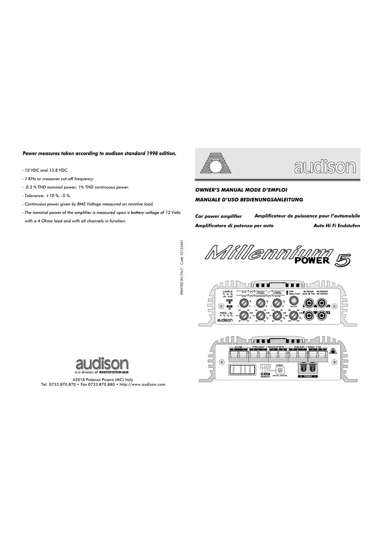 Amplificatore di potenza per auto Auto Hi Fi Endstufen Car power amplifier Amplificateur de puissance pour l’automobile Power measures taken according to audison standard 1998 edition. - 12 VDC and 13.8 VDC. - 1 KHz or crossover cut-off frequency. - 0.3 % THD nominal power; 1% THD continuous power. - Tolerance: +10 %; -5 %. - Continuous power given by RMS Voltage measured on resistive load. - The nominal power of the amplifier is measured upon a battery voltage of 12 Volts with a 4 Ohms load and with all channels in function. PRINTED IN ITALY - Code 10125401 62018 Potenza Picena (MC) Italy Tel. 0733.870.870 • Fax 0733.870.880 • http://www.audison.com is a division ofMILLENNIUM POWER 5 (MP5): FEATURES