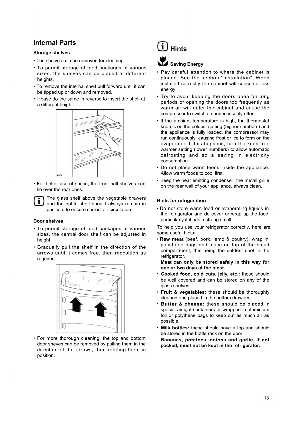 - For more thorough cleaning, the top and bottom door sheves can be removed by pulling them in the direction of the arrows, then refitting them in position.