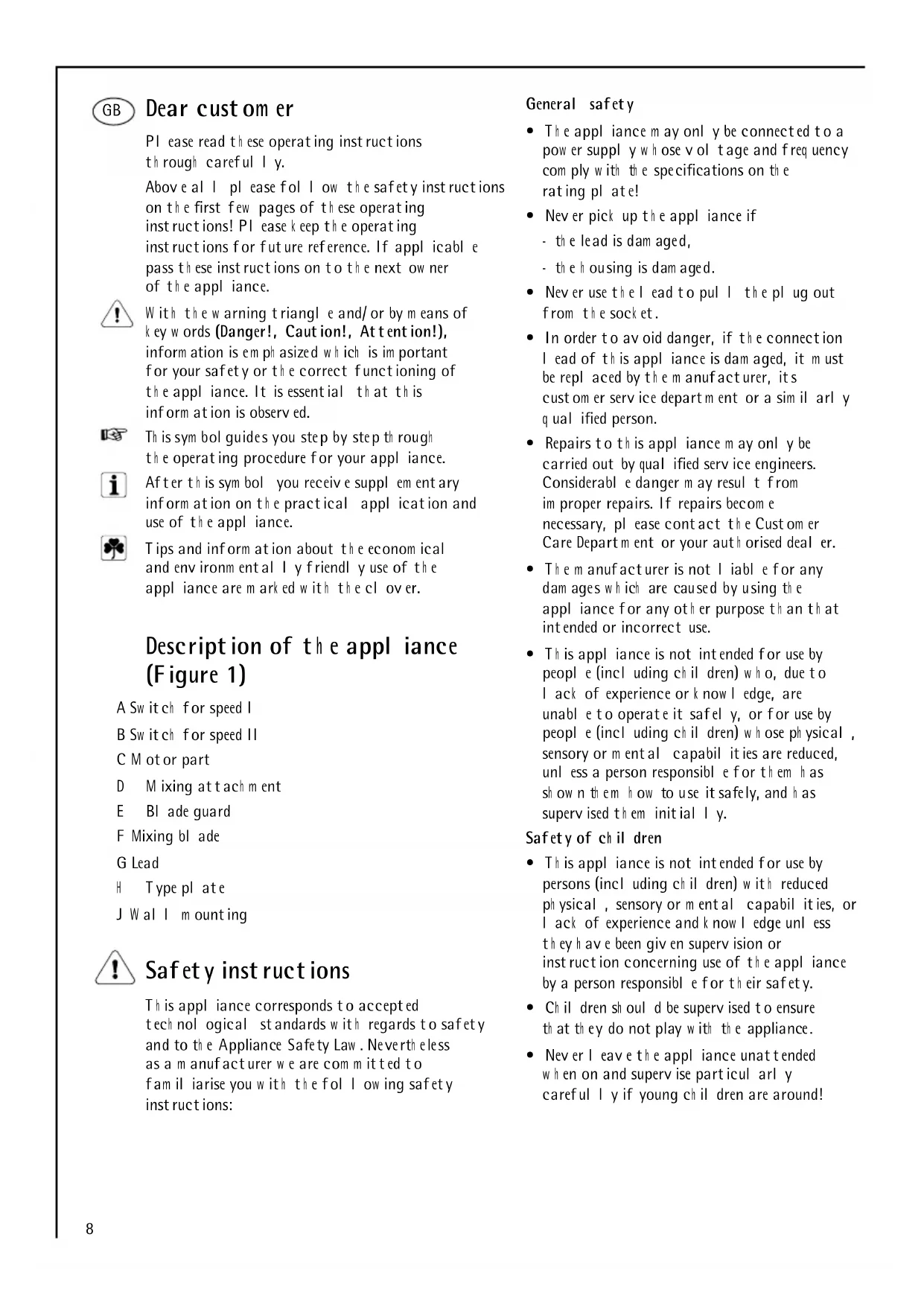 - EMC Norm 89 /336/EEC und Ergänzung 9 2/31/EEC sow ie 9 3/68/EEC8 Dear custom er Please read th ese operating instructions th rough carefully. Above all please follow th e safety instructions on th e first few pages of th ese operating instructions! Please k eep th e operating instructions for future reference. If applicable pass th ese instructions on to th e next ow ner of th e appliance. W ith th e w arning triangle and/or by m eans of k ey w ords (Danger!, Caution!, Attention!), inform ation is em ph asized w h ich is im portant for your safety or th e correct functioning of th e appliance. It is essential th at th is inform ation is observed. Th is sym bol guides you step by step th rough th e operating procedure for your appliance. After th is sym bol you receive supplem entary inform ation on th e practical application and use of th e appliance. Tips and inform ation about th e econom ical and environm entally friendly use of th e appliance are m ark ed w ith th e clover. Description of th e appliance (Figure 1) A Sw itch for speed I B Sw itch for speed II C M otor part D M ixing attach m ent E Blade guard F Mixing blade G Lead H Type plate J W all m ounting Safety instructions Th is appliance corresponds to accepted tech nological standards w ith regards to safety and to th e Appliance Safety Law . Neverth eless as a m anufacturer w e are com m itted to fam iliarise you w ith th e follow ing safety instructions: General safety
