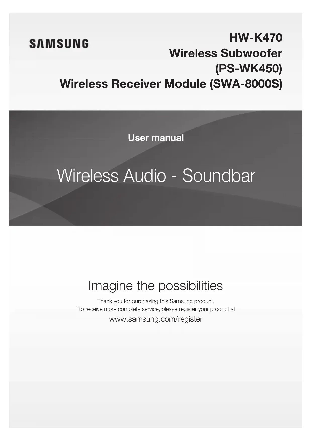 Wireless Audio - Soundbar Imagine the possibilities Thank you for purchasing this Samsung product.To receive more complete service, please register your product at www.samsung.com/register User manual HW-K470 Wireless Subwoofer (PS-WK450) Wireless Receiver Module (SWA-8000S)2 GETTING STARTED FEATURES GETTING STARTED Samsung Remote App Hold the control of your Soundbar in the palm of your hand with an Android smart device and the Samsung Audio Remote app. This convenient app lets you control all the Soundbar's basic functions such as power, volume, and the media controls, and lets you control customizable functions such as the equalizer. Surround Sound Expansion The Surround Sound Expansion feature adds depth and spaciousness to your listening experience. TV SoundConnect Listen to TV audio through the Soundbar by connecting your TV and the Soundbar via Bluetooth with TV SoundConnect. Easy connectivity and the absence of trailing wires between the Soundbar and TV allows you to showcase the slim and sleek design of both systems, while maintaining a clean look in your living environment. Easily control the Soundbar and TV from a single TV remote. HDMI HDMI transmits digital video and audio signals simultaneously, and provides a clearer picture. The unit is also equipped with the ARC function which lets you listen to sound from your TV through the Soundbar via an HDMI cable. This function is only available if you connect the unit to an ARC compliant TV. USB Host Support You can connect and play music files from external USB storage devices such as MP3 players, USB flash memory, etc. using the Soundbar's USB HOST function. Bluetooth Function You can connect a Bluetooth device to the Soundbar and enjoy music with high quality stereo sound, all without wires! LICENSES Manufactured under license from Dolby Laboratories. Dolby, Dolby Audio, Pro Logic, and the double-D symbol are trademarks of Dolby Laboratories. For DTS patents, see http://patents.dts.com. Manufactured under license from DTS Licensing Limited. DTS, the Symbol, DTS in combination with the Symbol, and DTS 2.0 Channel are registered trademarks or trademarks of DTS, Inc. in the United States and/or other countries. © DTS, Inc. All Rights Reserved. The terms HDMI and HDMI High-Definition Multimedia Interface, and the HDMI Logo are trademarks or registered trademarks of HDMI Licensing LLC in the United States and other countries.ENG