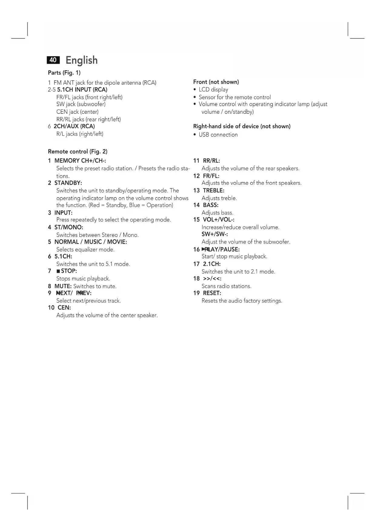 - USB connection Remote control (Fig. 2) 1 MEMORY CH+/CH-: Selects the preset radio station. / Presets the radio sta- tions. 2 STANDBY: Switches the unit to standby/operating mode. The operating indicator lamp on the volume control shows the function. (Red = Standby, Blue = Operation) 3 INPUT: Press repeatedly to select the operating mode. 4 ST/MONO: Switches between Stereo / Mono. 5 NORMAL / MUSIC / MOVIE: Selects equalizer mode. 6 5.1CH: Switches the unit to 5.1 mode.