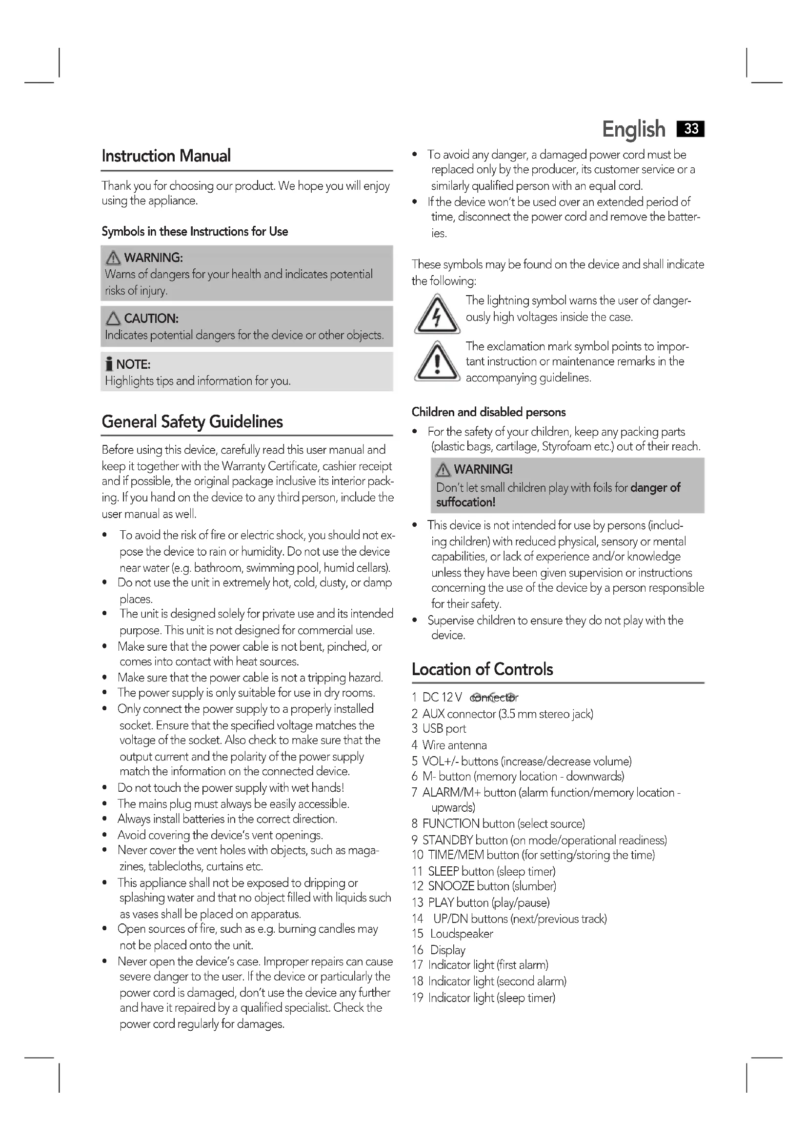 - For the safety of your children, keep any packing parts (plastic bags, cartilage, Styrofoam etc.) out of their reach.
