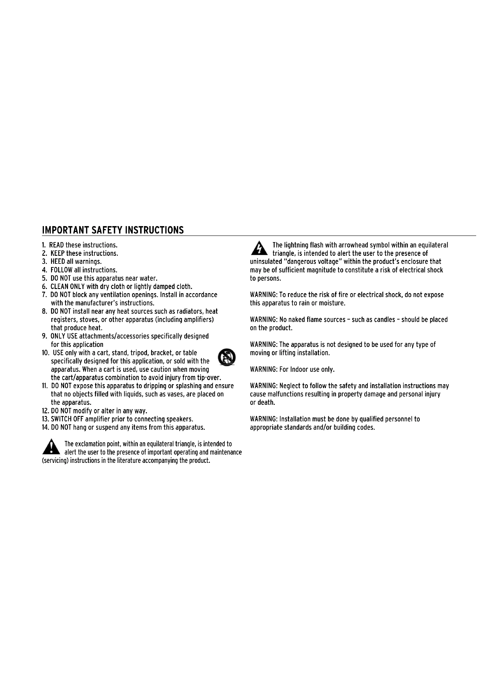 The exclamation point, within an equilateral triangle, is intended to alert the user to the presence of important operating and maintenance (servicing) instructions in the literature accompanying the product. The lightning flash with arrowhead symbol within an equilateral triangle, is intended to alert the user to the presence of uninsulated “dangerous voltage” within the product’s enclosure that may be of sufficient magnitude to constitute a risk of electrical shock to persons.