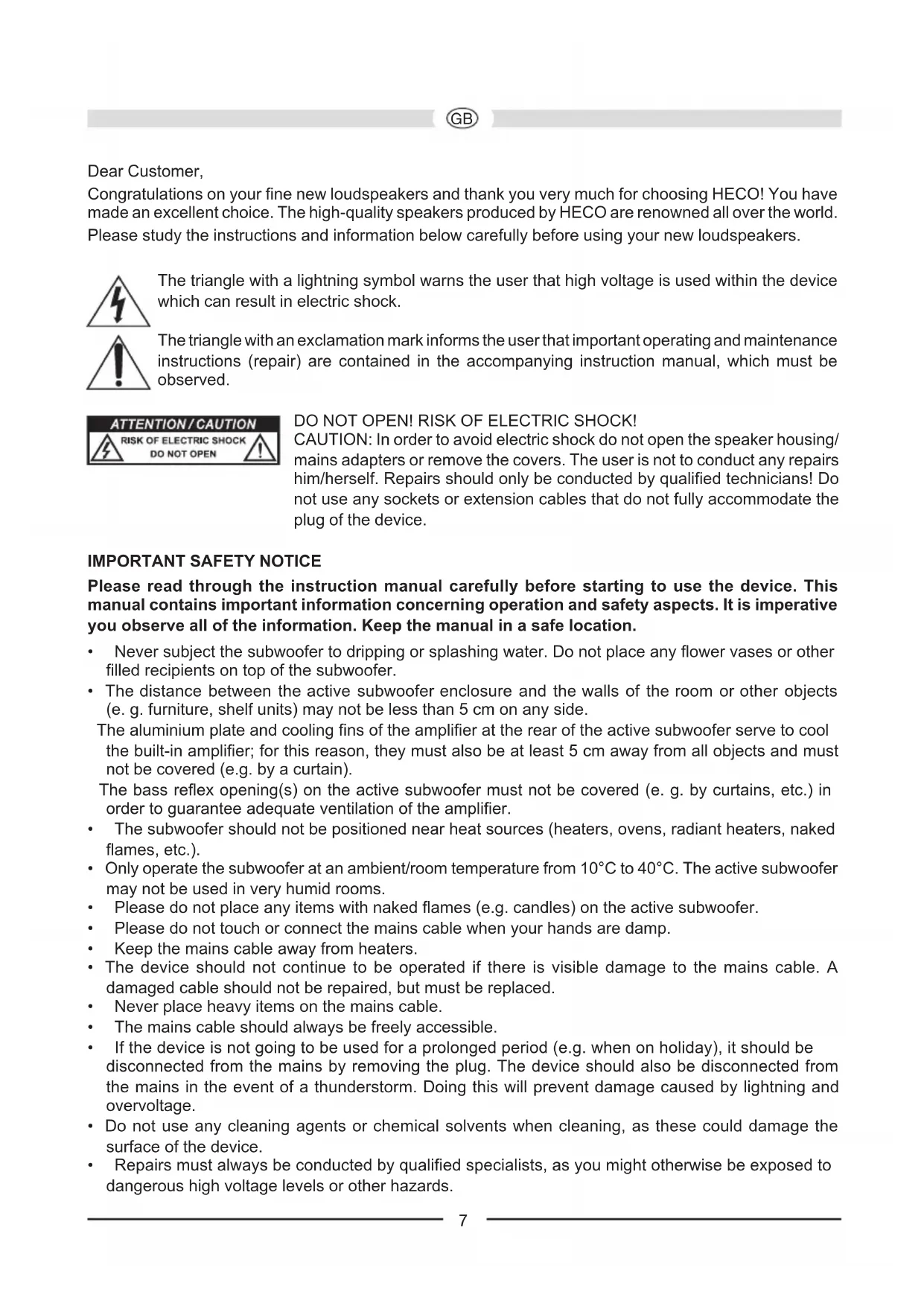 Dear Customer, Congratulations on your fine new loudspeakers and thank you very much for choosing HECO! You have made an excellent choice. The high-quality speakers produced by HECO are renowned all over the world. Please study the instructions and information below carefully before using your new loudspeakers. The triangle with a lightning symbol warns the user that high voltage is used within the device which can result in electric shock. The triangle with an exclamation mark informs the user that important operating and maintenance instructions (repair) are contained in the accompanying instruction manual, which must be observed. DO NOT OPEN! RISK OF ELECTRIC SHOCK! CAUTION: In order to avoid electric shock do not open the speaker housing/ mains adapters or remove the covers. The user is not to conduct any repairs him/herself. Repairs should only be conducted by qualified technicians! Do not use any sockets or extension cables that do not fully accommodate the plug of the device.