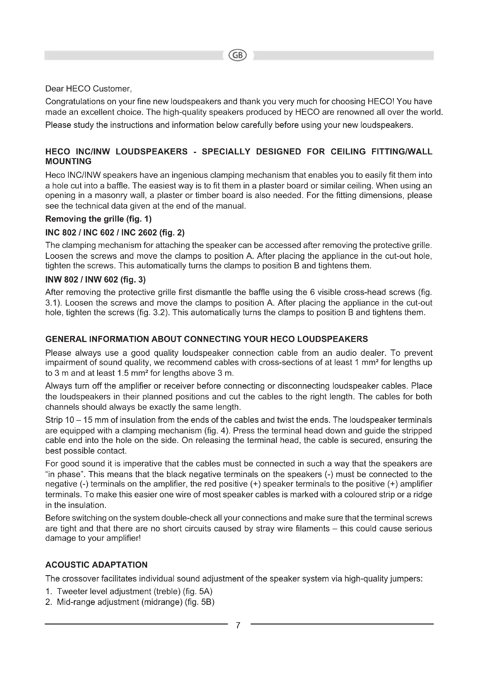 Belastbarkeit: 120 / 200 Watt 100 / 180 Watt 100 / 180 Watt Impedanz 4 – 8 Ohm 4 – 8 Ohm 2 x 4 Ohm Übergangsfrequenz: 3500 Hz 3500 Hz 3600 Hz Frequenzbereich: 32 – 32.000 Hz 35 – 32.000 Hz 35 – 30.000 Hz Empfohlene Verstärkerleistung: 30 – 180 Watt 30 – 140 Watt 30 – 160 Watt Wirkungsgrad (1 Watt/1 m): 91 dB 90 dB 90 dB Außenmaß Ø: 272 mm 231 mm 231 mm Lochausschnitt Ø: 242 mm 198 mm 198 mm Einbautiefe: 112 mm 98 mm 92 mm INW 802 INW 602 Belastbarkeit: 120 / 200 Watt 100 / 180 Watt Impedanz 4 Ohm 4 – 8 Ohm Übergangsfrequenz: 3500 Hz 3500 Hz Frequenzbereich: 32 – 32.000 Hz 38 – 32.000 Hz Empfohlene Verstärkerleistung: 30 – 180 Watt 30 – 160 Watt Wirkungsgrad (1 Watt/1 m): 91 dB 90 dB Außenmaß (B x H): 253 x 356 mm 219 x 306 mm Lochausschnitt (BxH): 223 x 325 mm 188 x 274 mm Einbautiefe: 90 mm 75 mm Technische Änderungen vorbehalten. 6Dear HECO Customer, Congratulations on your fine new loudspeakers and thank you very much for choosing HECO! You have made an excellent choice. The high-quality speakers produced by HECO are renowned all over the world. Please study the instructions and information below carefully before using your new loudspeakers. HECO INC/INW LOUDSPEAKERS - SPECIALLY DESIGNED FOR CEILING FITTING/WALL MOUNTING Heco INC/INW speakers have an ingenious clamping mechanism that enables you to easily fit them into a hole cut into a baffle. The easiest way is to fit them in a plaster board or similar ceiling. When using an opening in a masonry wall, a plaster or timber board is also needed. For the fitting dimensions, please see the technical data given at the end of the manual. Removing the grille (fig. 1) INC 802 / INC 602 / INC 2602 (fig. 2) The clamping mechanism for attaching the speaker can be accessed after removing the protective grille. Loosen the screws and move the clamps to position A. After placing the appliance in the cut-out hole, tighten the screws. This automatically turns the clamps to position B and tightens them. INW 802 / INW 602 (fig. 3) After removing the protective grille first dismantle the baffle using the 6 visible cross-head screws (fig. 3.1). Loosen the screws and move the clamps to position A. After placing the appliance in the cut-out hole, tighten the screws (fig. 3.2). This automatically turns the clamps to position B and tightens them. GENERAL INFORMATION ABOUT CONNECTING YOUR HECO LOUDSPEAKERS Please always use a good quality loudspeaker connection cable from an audio dealer. To prevent impairment of sound quality, we recommend cables with cross-sections of at least 1 mm² for lengths up to 3 m and at least 1.5 mm² for lengths above 3 m. Always turn off the amplifier or receiver before connecting or disconnecting loudspeaker cables. Place the loudspeakers in their planned positions and cut the cables to the right length. The cables for both channels should always be exactly the same length. Strip 10 – 15 mm of insulation from the ends of the cables and twist the ends. The loudspeaker terminals are equipped with a clamping mechanism (fig. 4). Press the terminal head down and guide the stripped cable end into the hole on the side. On releasing the terminal head, the cable is secured, ensuring the best possible contact. For good sound it is imperative that the cables must be connected in such a way that the speakers are “in phase”. This means that the black negative terminals on the speakers (-) must be connected to the negative (-) terminals on the amplifier, the red positive (+) speaker terminals to the positive (+) amplifier terminals. To make this easier one wire of most speaker cables is marked with a coloured strip or a ridge in the insulation. Before switching on the system double-check all your connections and make sure that the terminal screws are tight and that there are no short circuits caused by stray wire filaments – this could cause serious damage to your amplifier! ACOUSTIC ADAPTATION The crossover facilitates individual sound adjustment of the speaker system via high-quality jumpers: