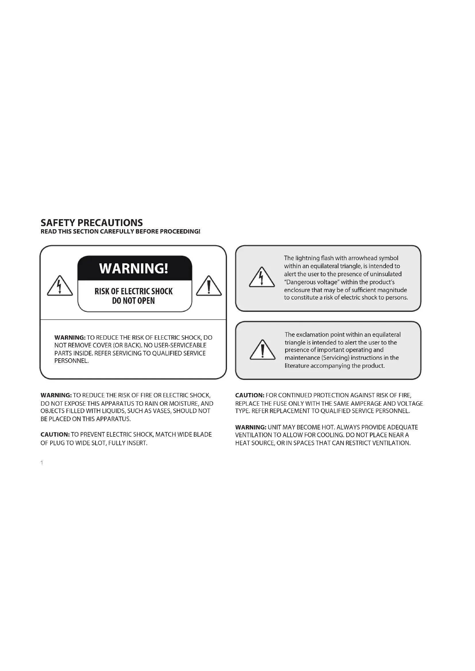 The lightning flash with arrowhead symbol within an equilateral triangle, is intended to alert the user to the presence of uninsulated “Dangerous voltage” within the product’s enclosure that may be of sufficient magnitude to constitute a risk of electric shock to persons. The exclamation point within an equilateral triangle is intended to alert the user to the presence of important operating and maintenance (Servicing) instructions in the literature accompanying the product.