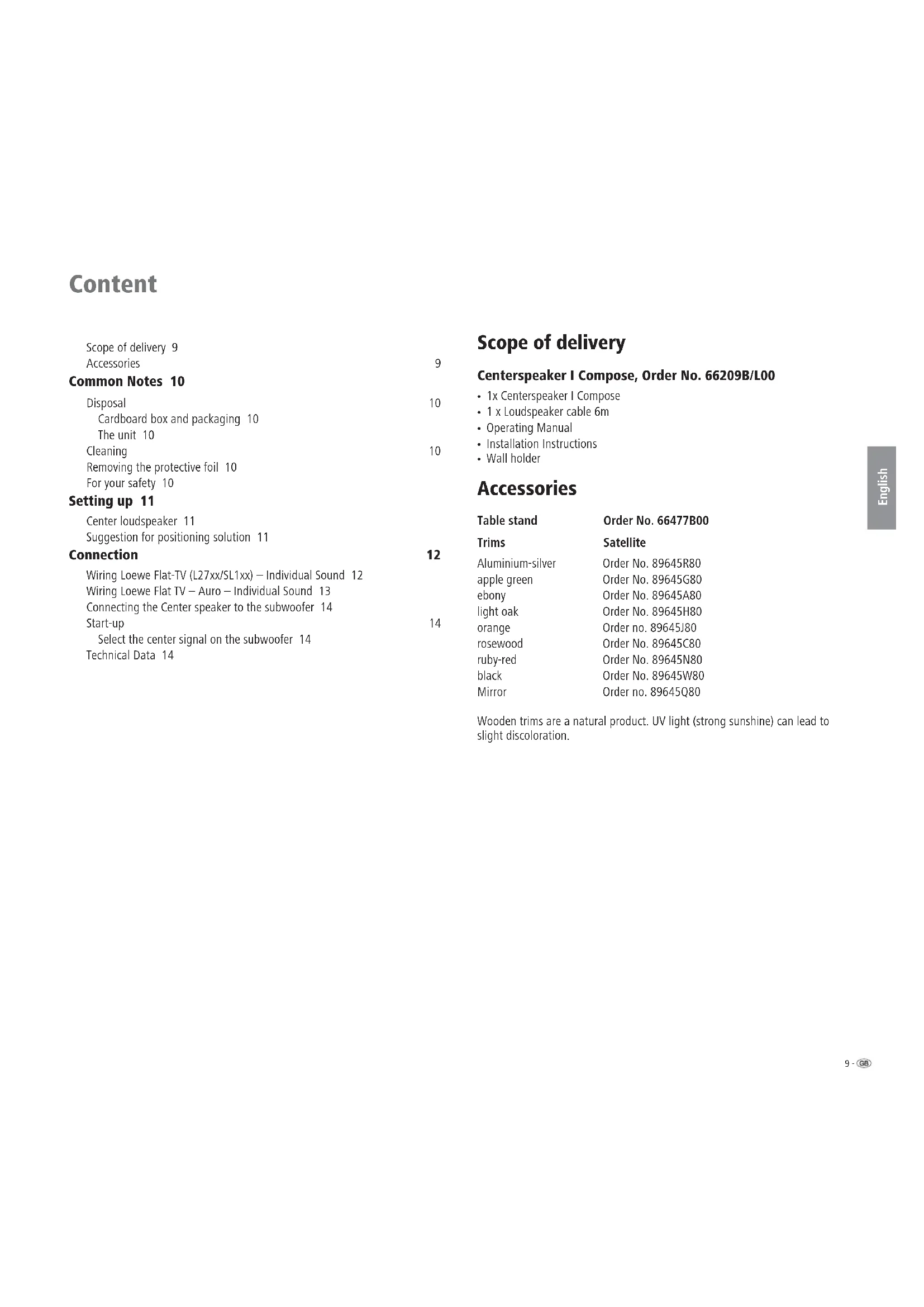 - Wall holder Accessories Table stand Order No. 66477B00 Trims Satellite Aluminium-silver Order No. 89645R80 apple green Order No. 89645G80 ebony Order No. 89645A80 light oak Order No. 89645H80 orange Order no. 89645J80 rosewood Order No. 89645C80 ruby-red Order No. 89645N80 black Order No. 89645W80 Mirror Order no. 89645Q80 Wooden trims are a natural product. UV light (strong sunshine) can lead to slight discoloration.- 10 English Common Notes Disposal Cardboard box and packaging You have opted for a durable and technically sophisticated product. In line with national regulations regarding the disposal of packaging materials, we pay a fee to authorised recyclers who collect packaging from dealers. However, we recommend that you keep the original cardboard box and the rest of the pa- ckaging materials so that the unit can, if necessary, be transported in the safest possible conditions. The unit Important: The EU Directive 2002/96/EG governs the proper re-acceptance, handling and recycling of used electronic appliances. Old electronic appliances must therefore be disposed of sepa- rately. Never throw this set in the normal domestic waste. You can hand in your old set free of charge at identi ed collection points or at your dealer if you buy a similar new set. Other details about re-acceptance (also for non-EU countries) are available from your local administration. Cleaning Only clean your Loudspeaker system with a damp, soft, clean cloth (without aggressive cleaning agents). Removing the protective foil Slowly and carefully remove the protective foil on the trim. For your safety For your safety and to avoid unnecessary damage to your TV set, please read and observe the following safety instructions: