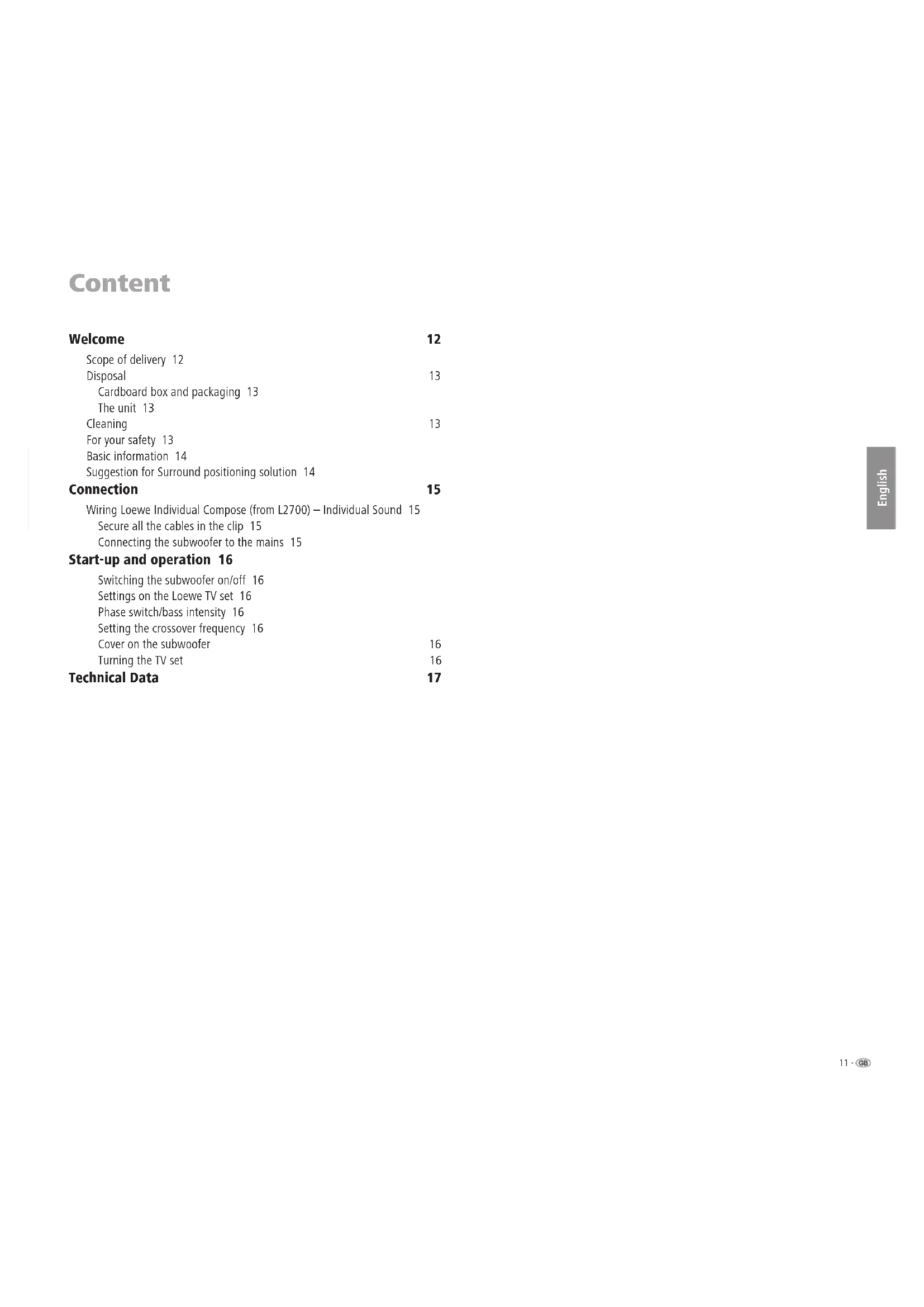 Bass IntensityPhaseMin. Max.0 180Crossover FrequencyAudio LinkSystem connector50 250. Mount the Audio Link cable with the 25-pin plug on the TV set and subwoofer. Connect the loudspeakers and the TV Stand Compose as shown in the fi gure on the right. Mount the Individual Compose on the TV Stand Compose as described in the enclosed installation instructions. Secure all the cables in the clip Open the cable clip at the bottom of the subwoofer, lay all the cables in it and close the clip again. This fi xes the cables. Connecting the subwoofer to the mains Plug the mains plug of the subwoofer into a 230 V AC socket. Audio Link cable Front left Front right Individual Compose Surround right Surround left Loewe Individual Sound System (subwoofer) Loewe Flat-TV Center Floor Stand I Compose- 16 English Start-up and operation Before beginning with start-up and operation, make sure that all the cables are connected correctly. Switching the subwoofer on/off You switch the Individual Sound loudspeaker system on in position “I – ON” with the ON/OFF switch . If the subwoofer is connected as described on page 15, there is no need to switch the subwoofer on and off separately any more. After switching on the subwoofer for the fi rst time, it is always switched on and off immediately with the Loewe TV set. Settings on the Loewe TV set Make the necessary settings on your Loewe Auro Preceiver as described in the Auro operating manual in the chapter “Initial start-up”. Phase switch/bass intensity The “Phase” switch and the “Bass intensity” knob enable you to optimize bass reproduction. We recommend you to proceed as follows: If the subwoofer is in the corner of the room, set the bass intensity knob to “Min”. If the subwoofer is against a wall, set the bass intensity knob to the center position. If the subwoofer is standing freely in the room, set the bass intensity knob to “Max”. Start DVD playback for example and select a title with bass parts. Have a second person activate the phase switch whilst you sit and listen. Decide for yourself which switch position reproduces the best bass sound. Set the bass intensity to suit your taste if necessary.