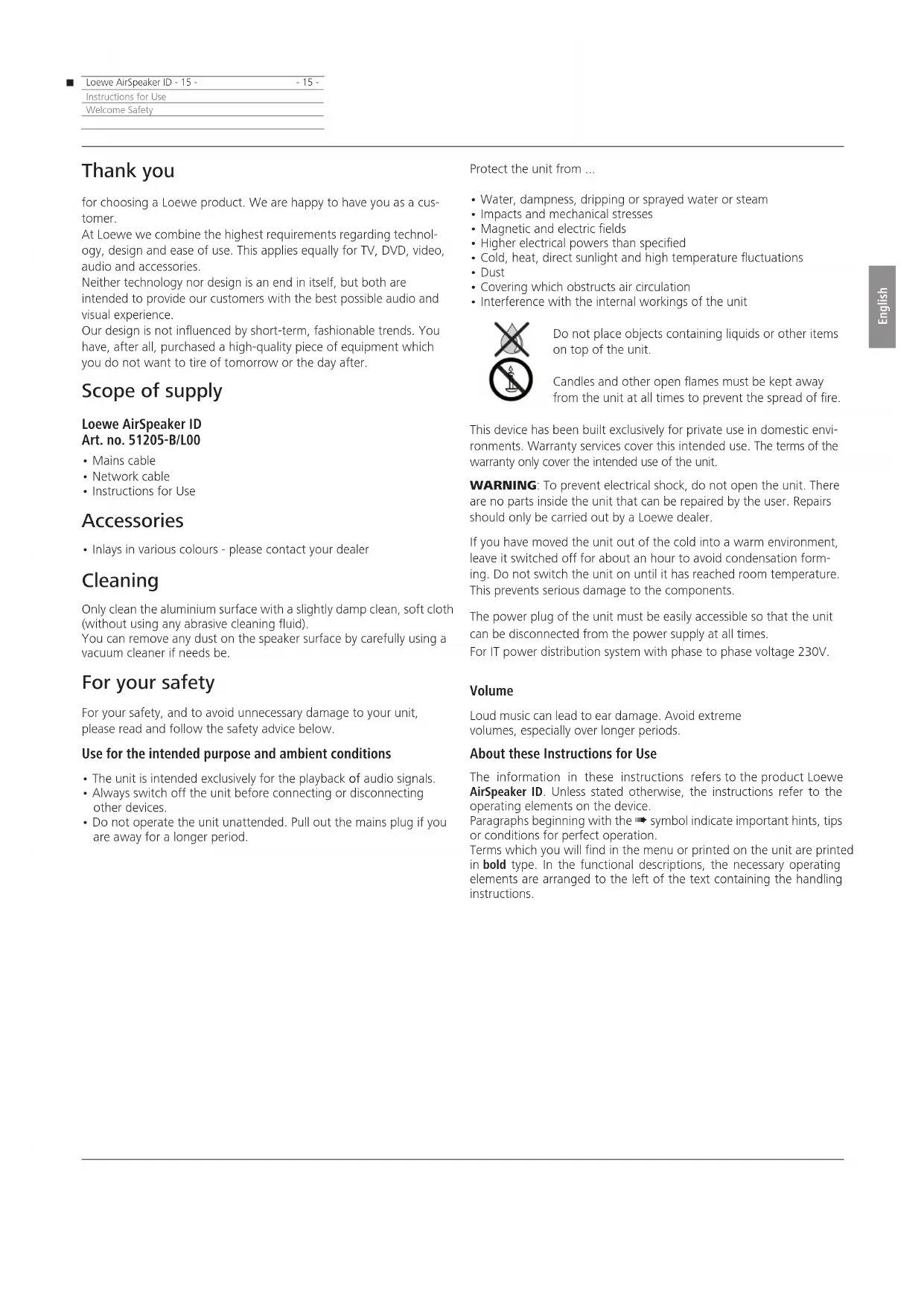 - 15 -Instructions for UseWelcome Safety Thank you for choosing a Loewe product. We are happy to have you as a cus- tomer. At Loewe we combine the highest requirements regarding technol- ogy, design and ease of use. This applies equally for TV, DVD, video, audio and accessories. Neither technology nor design is an end in itself, but both are intended to provide our customers with the best possible audio and visual experience. Our design is not inuenced by short-term, fashionable trends. You have, after all, purchased a high-quality piece of equipment which you do not want to tire of tomorrow or the day after. Scope of supply Loewe AirSpeaker ID Art. no. 51205-B/L00
