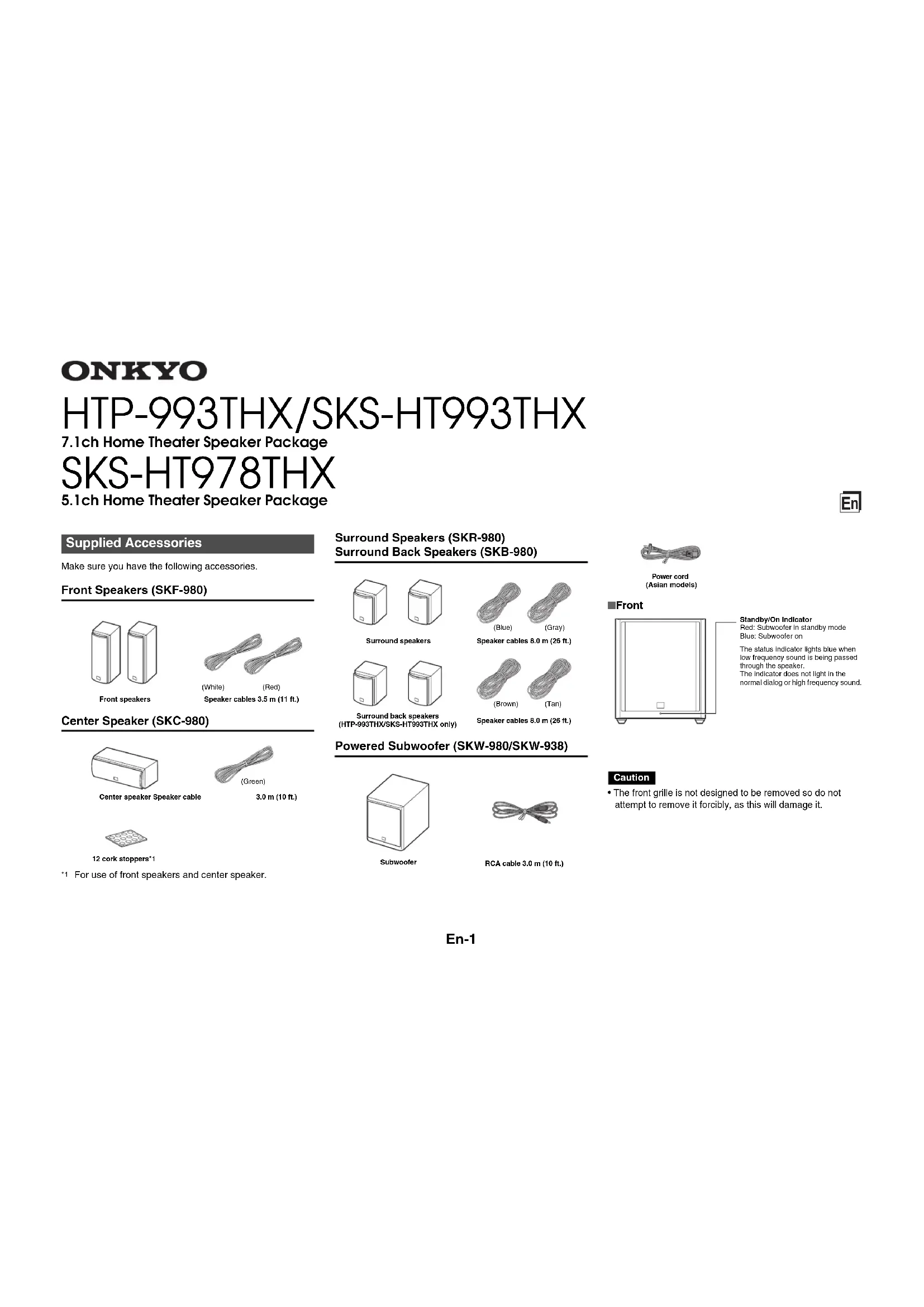 En-1 7.1ch Home Theater Speaker Package Make sure you have the following accessories.Front Speakers (SKF-980)Center Speaker (SKC-980) For use of front speakers and center speaker.Surround Speakers (SKR-980)Surround Back Speakers (SKB-980)Powered Subwoofer (SKW-980/SKW-938)■ Front Caution