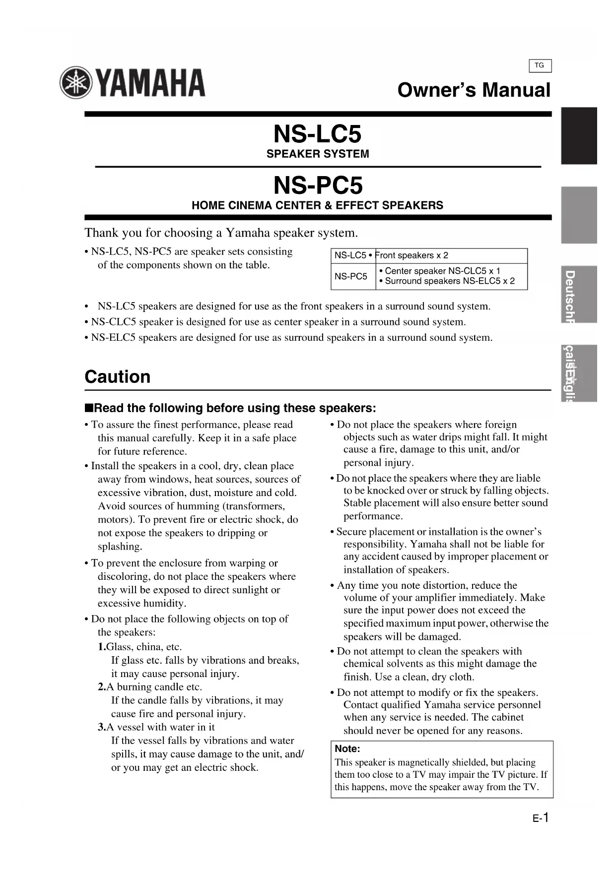 - NS-CLC5 speaker is designed for use as center speaker in a surround sound system.• NS-ELC5 speakers are designed for use as surround speakers in a surround sound system. Caution ■ Read the following before using these speakers:• To assure the finest performance, please read this manual carefully. Keep it in a safe place for future reference.• Install the speakers in a cool, dry, clean place away from windows, heat sources, sources of excessive vibration, dust, moisture and cold. Avoid sources of humming (transformers, motors). To prevent fire or electric shock, do not expose the speakers to dripping or splashing.• To prevent the enclosure from warping or discoloring, do not place the speakers where they will be exposed to direct sunlight or excessive humidity.• Do not place the following objects on top of the speakers:1. Glass, china, etc.If glass etc. falls by vibrations and breaks, it may cause personal injury.2. A burning candle etc.If the candle falls by vibrations, it may cause fire and personal injury.3. A vessel with water in itIf the vessel falls by vibrations and water spills, it may cause damage to the unit, and/or you may get an electric shock.• Do not place the speakers where foreign objects such as water drips might fall. It might cause a fire, damage to this unit, and/or personal injury.• Do not place the speakers where they are liable to be knocked over or struck by falling objects. Stable placement will also ensure better sound performance.• Secure placement or installation is the owner’s responsibility. Yamaha shall not be liable for any accident caused by improper placement or installation of speakers.• Any time you note distortion, reduce the volume of your amplifier immediately. Make sure the input power does not exceed the specified maximum input power, otherwise the speakers will be damaged.• Do not attempt to clean the speakers with chemical solvents as this might damage the finish. Use a clean, dry cloth.• Do not attempt to modify or fix the speakers. Contact qualified Yamaha service personnel when any service is needed. The cabinet should never be opened for any reasons.NS-LC5 • Front speakers x 2NS-PC5• Center speaker NS-CLC5 x 1• Surround speakers NS-ELC5 x 2Note: This speaker is magnetically shielded, but placing them too close to a TV may impair the TV picture. If this happens, move the speaker away from the TV. Owner’s Manual