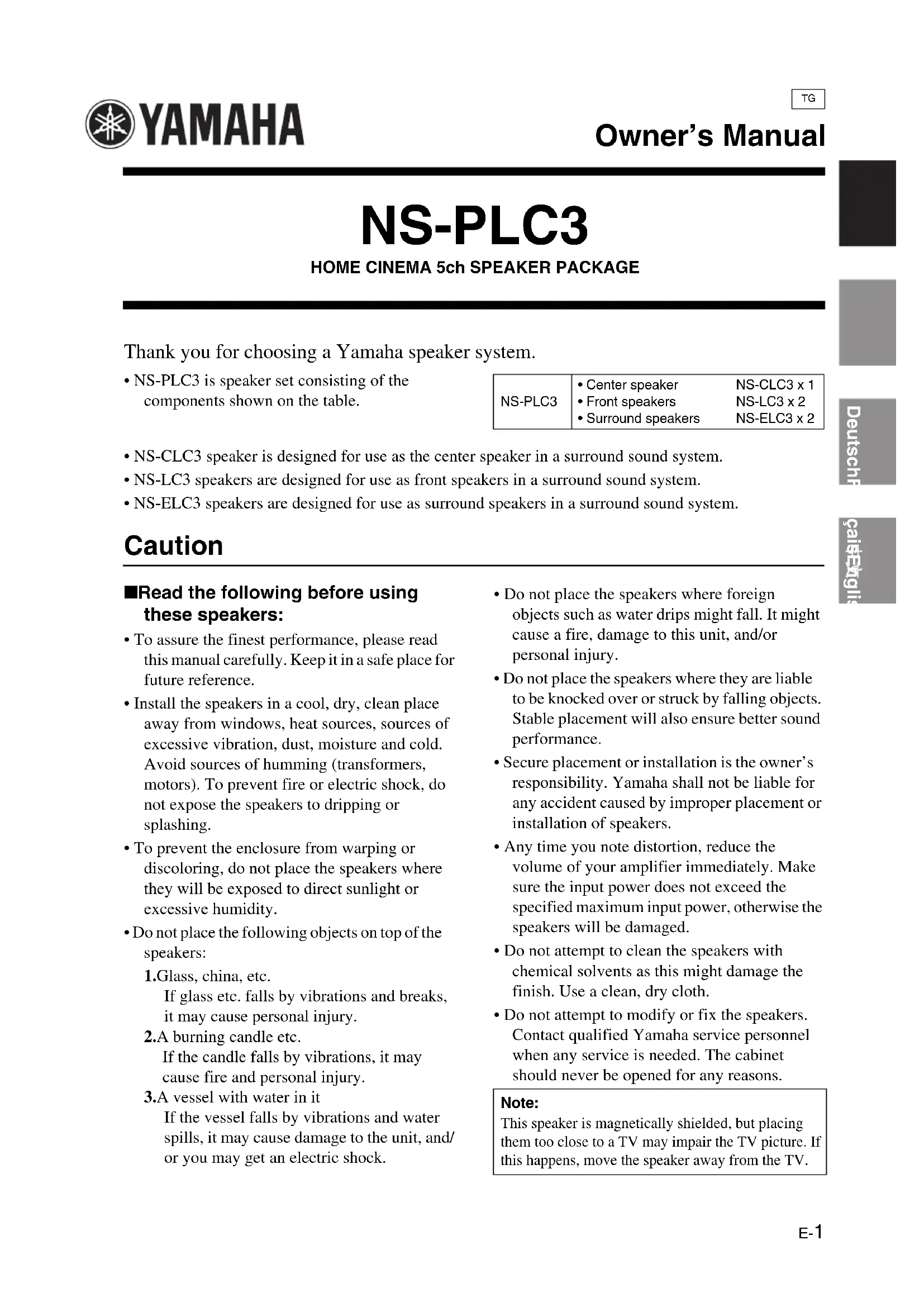 - NS-PLC3 is speaker set consisting of the components shown on the table.• NS-CLC3 speaker is designed for use as the center speaker in a surround sound system.• NS-LC3 speakers are designed for use as front speakers in a surround sound system.• NS-ELC3 speakers are designed for use as surround speakers in a surround sound system. Caution ■ Read the following before using these speakers:• To assure the finest performance, please read this manual carefully. Keep it in a safe place for future reference.• Install the speakers in a cool, dry, clean place away from windows, heat sources, sources of excessive vibration, dust, moisture and cold. Avoid sources of humming (transformers, motors). To prevent fire or electric shock, do not expose the speakers to dripping or splashing.• To prevent the enclosure from warping or discoloring, do not place the speakers where they will be exposed to direct sunlight or excessive humidity.• Do not place the following objects on top of the speakers:1. Glass, china, etc.If glass etc. falls by vibrations and breaks, it may cause personal injury.2. A burning candle etc.If the candle falls by vibrations, it may cause fire and personal injury.3. A vessel with water in itIf the vessel falls by vibrations and water spills, it may cause damage to the unit, and/or you may get an electric shock.• Do not place the speakers where foreign objects such as water drips might fall. It might cause a fire, damage to this unit, and/or personal injury.• Do not place the speakers where they are liable to be knocked over or struck by falling objects. Stable placement will also ensure better sound performance.• Secure placement or installation is the owner’s responsibility. Yamaha shall not be liable for any accident caused by improper placement or installation of speakers.• Any time you note distortion, reduce the volume of your amplifier immediately. Make sure the input power does not exceed the specified maximum input power, otherwise the speakers will be damaged.• Do not attempt to clean the speakers with chemical solvents as this might damage the finish. Use a clean, dry cloth.• Do not attempt to modify or fix the speakers. Contact qualified Yamaha service personnel when any service is needed. The cabinet should never be opened for any reasons.NS-PLC3• Center speaker• Front speakers• Surround speakersNS-CLC3 x 1NS-LC3 x 2NS-ELC3 x 2Note: This speaker is magnetically shielded, but placing them too close to a TV may impair the TV picture. If this happens, move the speaker away from the TV. Owner’s Manual