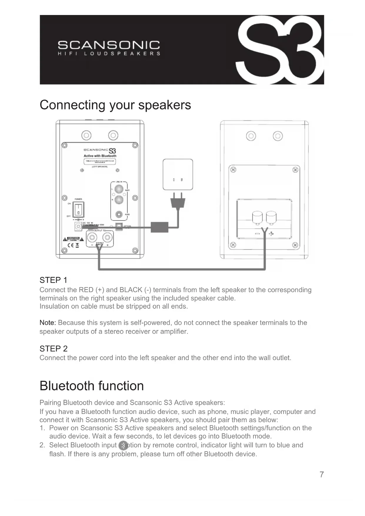 Please use your Bluetooth device to search the Bluetooth device named "Scansonic S3 Active speakers". If pairing code is needed, enter "0000" or "1234".