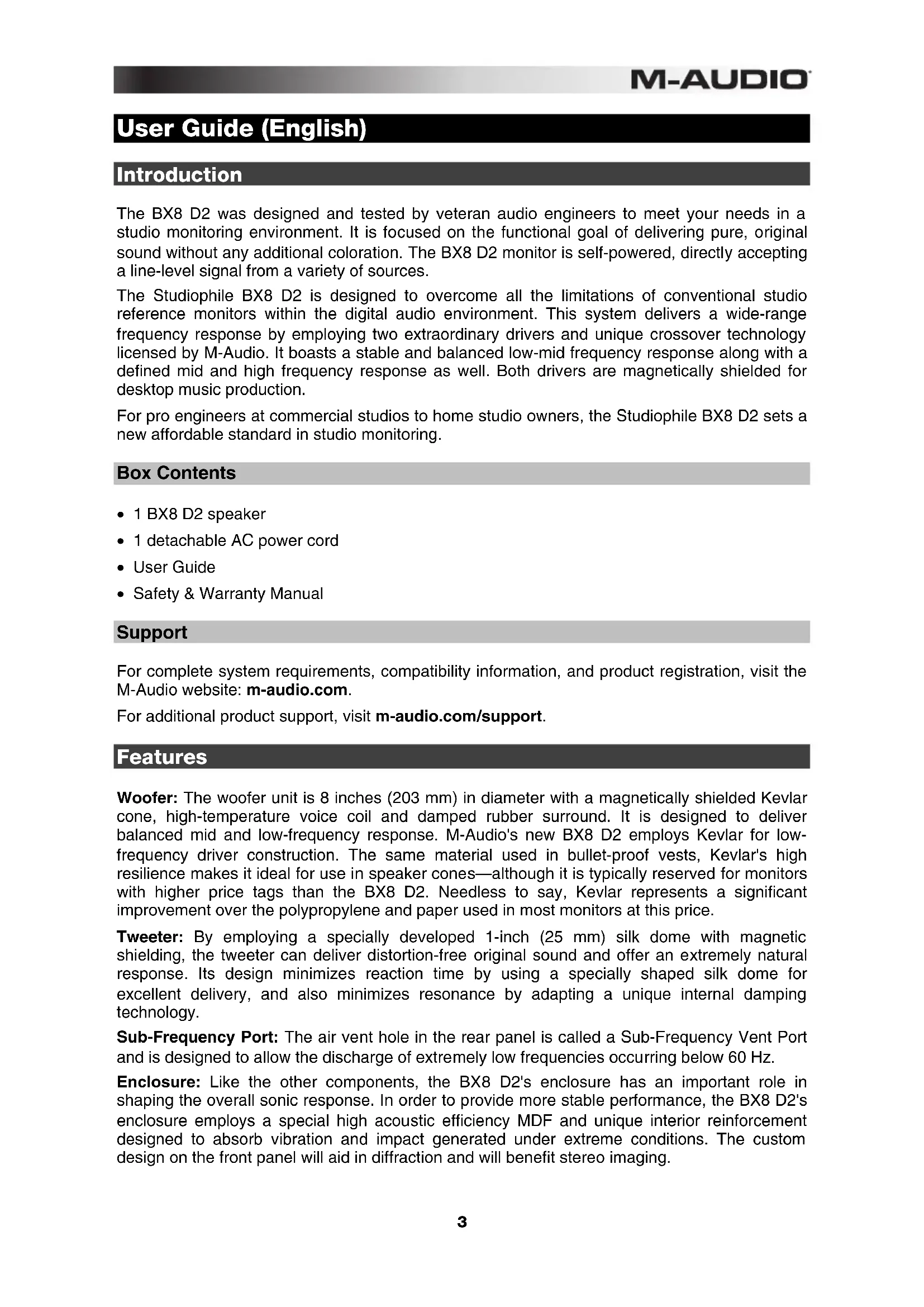 - Safety & Warranty Manual Support For complete system requirements, compatibility information, and product registration, visit the M-Audio website: m-audio.com. For additional product support, visit m-audio.com/support. Features Woofer: The woofer unit is 8 inches (203 mm) in diameter with a magnetically shielded Kevlar cone, high-temperature voice coil and damped rubber surround. It is designed to deliver balanced mid and low-frequency response. M-Audio's new BX8 D2 employs Kevlar for low- frequency driver construction. The same material used in bullet-proof vests, Kevlar's high resilience makes it ideal for use in speaker cones—although it is typically reserved for monitors with higher price tags than the BX8 D2. Needless to say, Kevlar represents a significant improvement over the polypropylene and paper used in most monitors at this price. Tweeter: By employing a specially developed 1-inch (25 mm) silk dome with magnetic shielding, the tweeter can deliver distortion-free original sound and offer an extremely natural response. Its design minimizes reaction time by using a specially shaped silk dome for excellent delivery, and also minimizes resonance by adapting a unique internal damping technology. Sub-Frequency Port: The air vent hole in the rear panel is called a Sub-Frequency Vent Port and is designed to allow the discharge of extremely low frequencies occurring below 60 Hz. Enclosure: Like the other components, the BX8 D2's enclosure has an important role in shaping the overall sonic response. In order to provide more stable performance, the BX8 D2's enclosure employs a special high acoustic efficiency MDF and unique interior reinforcement designed to absorb vibration and impact generated under extreme conditions. The custom design on the front panel will aid in diffraction and will benefit stereo imaging.4