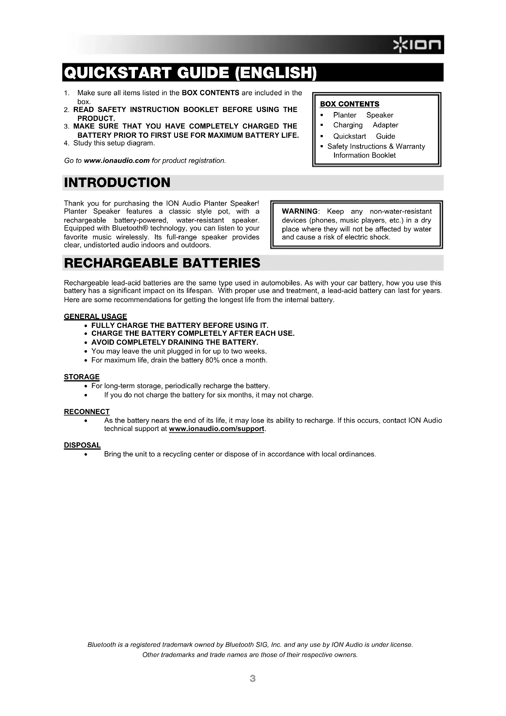 BOX CONTENTS Planter Speaker Charging Adapter Quickstart Guide Safety Instructions & Warranty Information Booklet Bluetooth is a registered trademark owned by Bluetooth SIG, Inc. and any use by ION Audio is under license. Other trademarks and trade names are those of their respective owners.