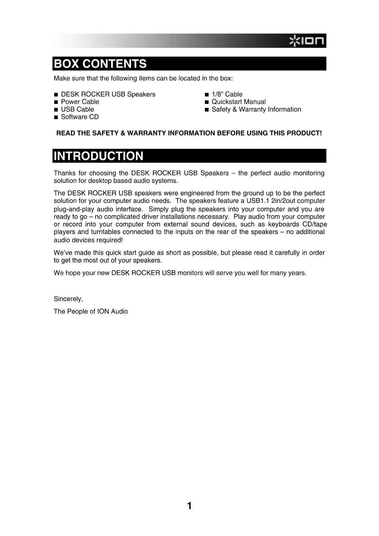 INTRODUCTION Thanks for choosing the DESK ROCKER USB Speakers – the perfect audio monitoring solution for desktop based audio systems. The DESK ROCKER USB speakers were engineered from the ground up to be the perfect solution for your computer audio needs. The speakers feature a USB1.1 2in/2out computer plug-and-play audio interface. Simply plug the speakers into your computer and you are ready to go – no complicated driver installations necessary. Play audio from your computer or record into your computer from external sound devices, such as keyboards CD/tape players and turntables connected to the inputs on the rear of the speakers – no additional audio devices required! We’ve made this quick start guide as short as possible, but please read it carefully in order to get the most out of your speakers. We hope your new DESK ROCKER USB monitors will serve you well for many years. Sincerely, The People of ION Audio2