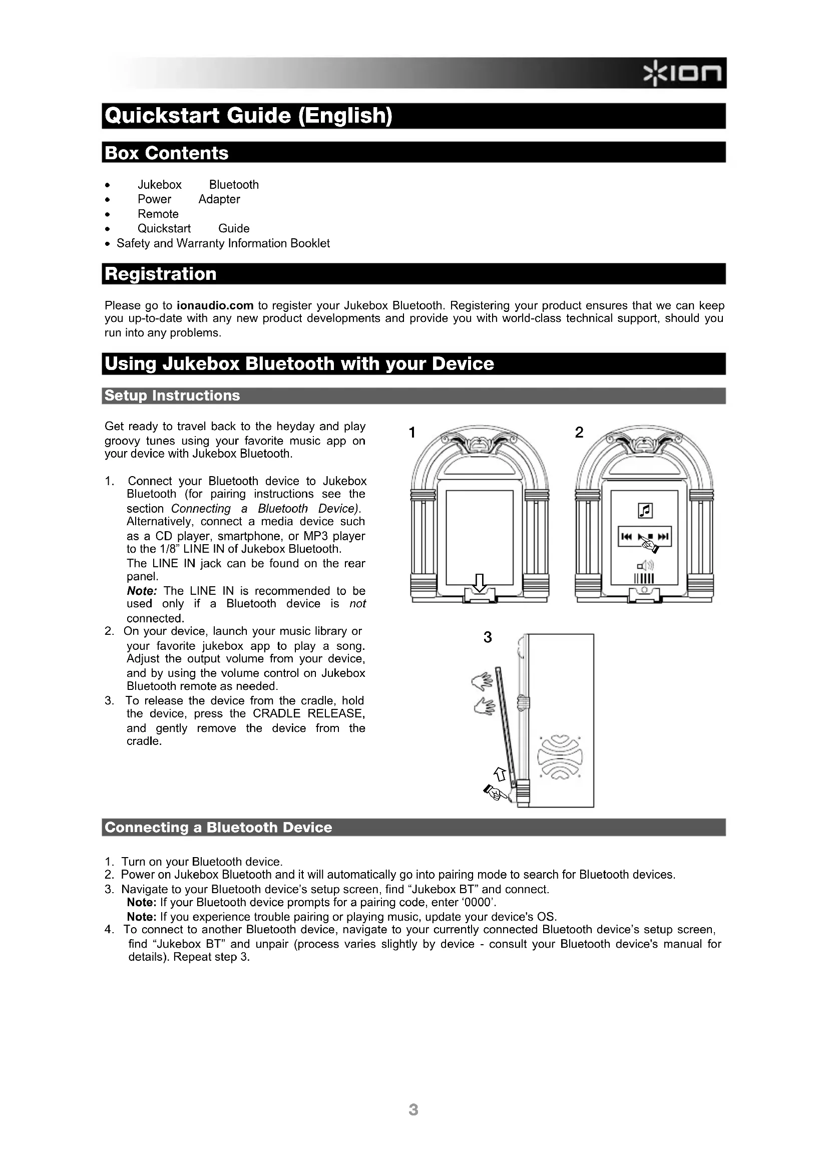 - Jukebox Bluetooth • Power Adapter • Remote • Quickstart Guide • Safety and Warranty Information Booklet Registration Please go to ionaudio.com to register your Jukebox Bluetooth. Registering your product ensures that we can keep you up-to-date with any new product developments and provide you with world-class technical support, should you run into any problems. Using Jukebox Bluetooth with your Device Setup Instructions Get ready to travel back to the heyday and play groovy tunes using your favorite music app on your device with Jukebox Bluetooth. 1. Connect your Bluetooth device to Jukebox Bluetooth (for pairing instructions see the section Connecting a Bluetooth Device). Alternatively, connect a media device such as a CD player, smartphone, or MP3 player to the 1/8” LINE IN of Jukebox Bluetooth. The LINE IN jack can be found on the rear panel. Note: The LINE IN is recommended to be used only if a Bluetooth device is not connected. 2. On your device, launch your music library or your favorite jukebox app to play a song. Adjust the output volume from your device, and by using the volume control on Jukebox Bluetooth remote as needed. 3. To release the device from the cradle, hold the device, press the CRADLE RELEASE, and gently remove the device from the cradle.