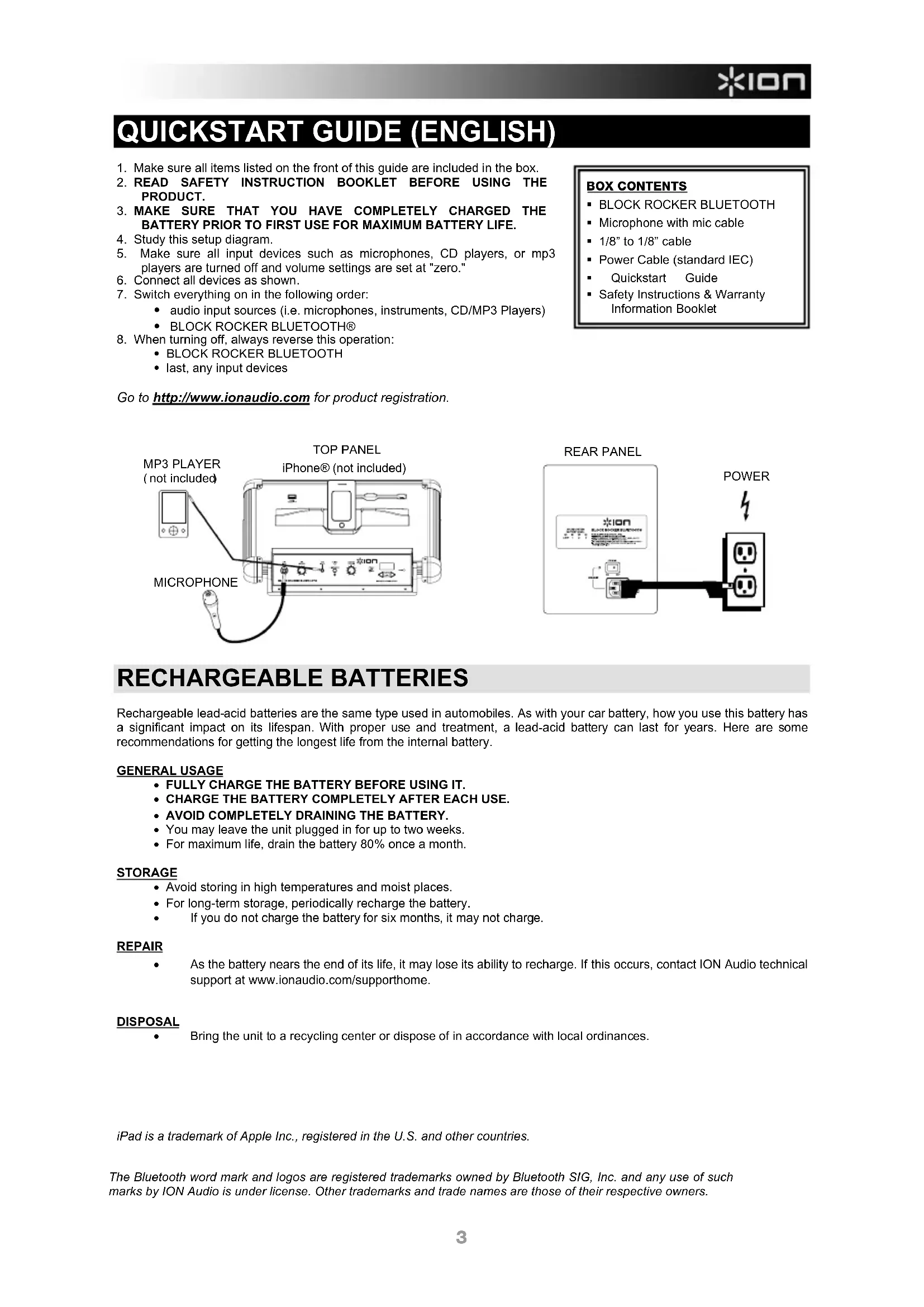 TOP PANEL MICROPHONEiPhone® (not included) iPad is a trademark of Apple Inc., registered in the U.S. and other countries. The Bluetooth word mark and logos are registered trademarks owned by Bluetooth SIG, Inc. and any use of suchmarks by ION Audio is under license. Other trademarks and trade names are those of their respective owners. MP3 PLAYER