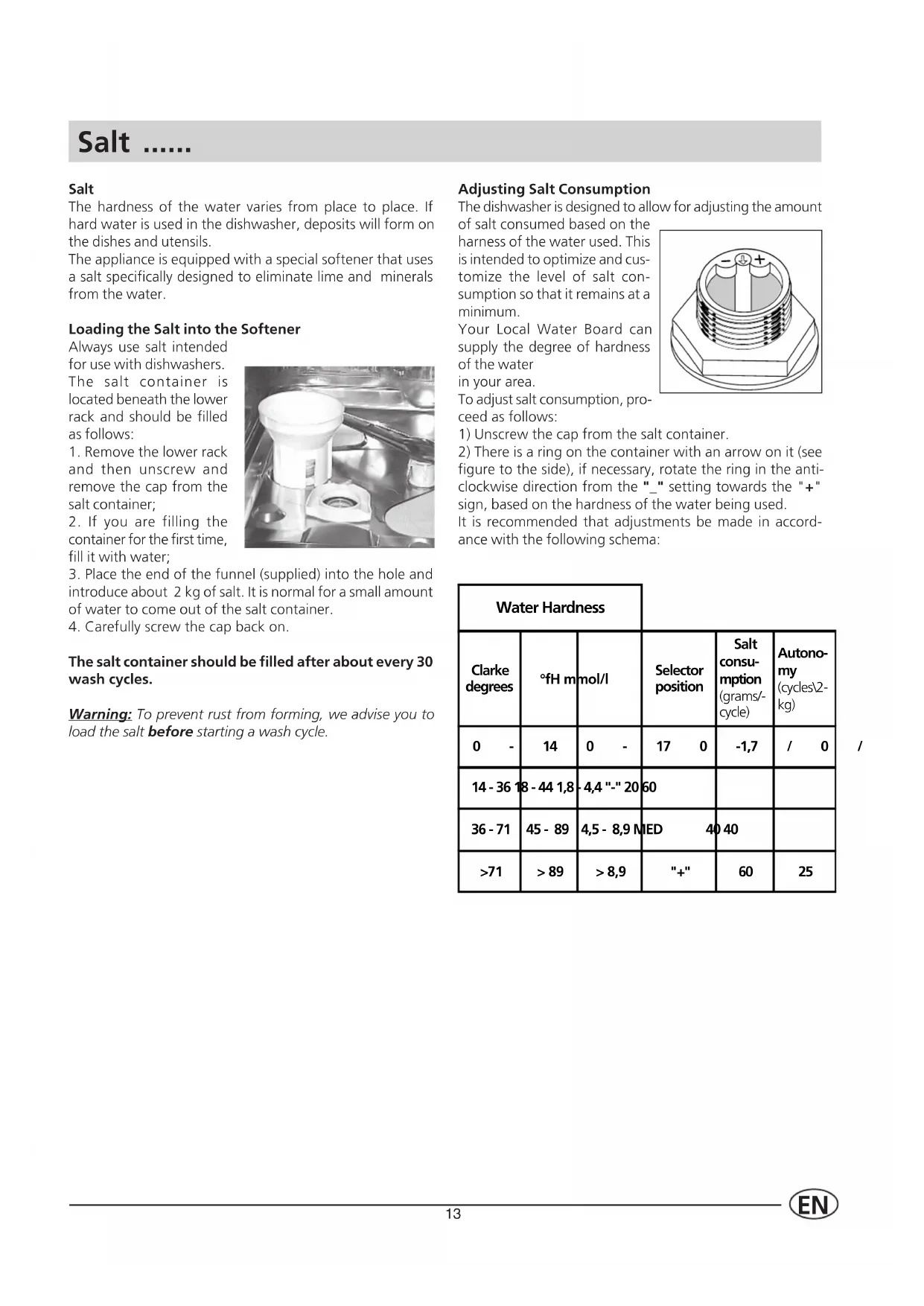 figure to the side), if necessary, rotate the ring in the anti- clockwise direction from the "_" setting towards the "+" sign, based on the hardness of the water being used. It is recommended that adjustments be made in accord- ance with the following schema: Water Hardness Clarke degrees °fH mmol/l Selector position Salt consu- mption (grams/-cycle) Autono-