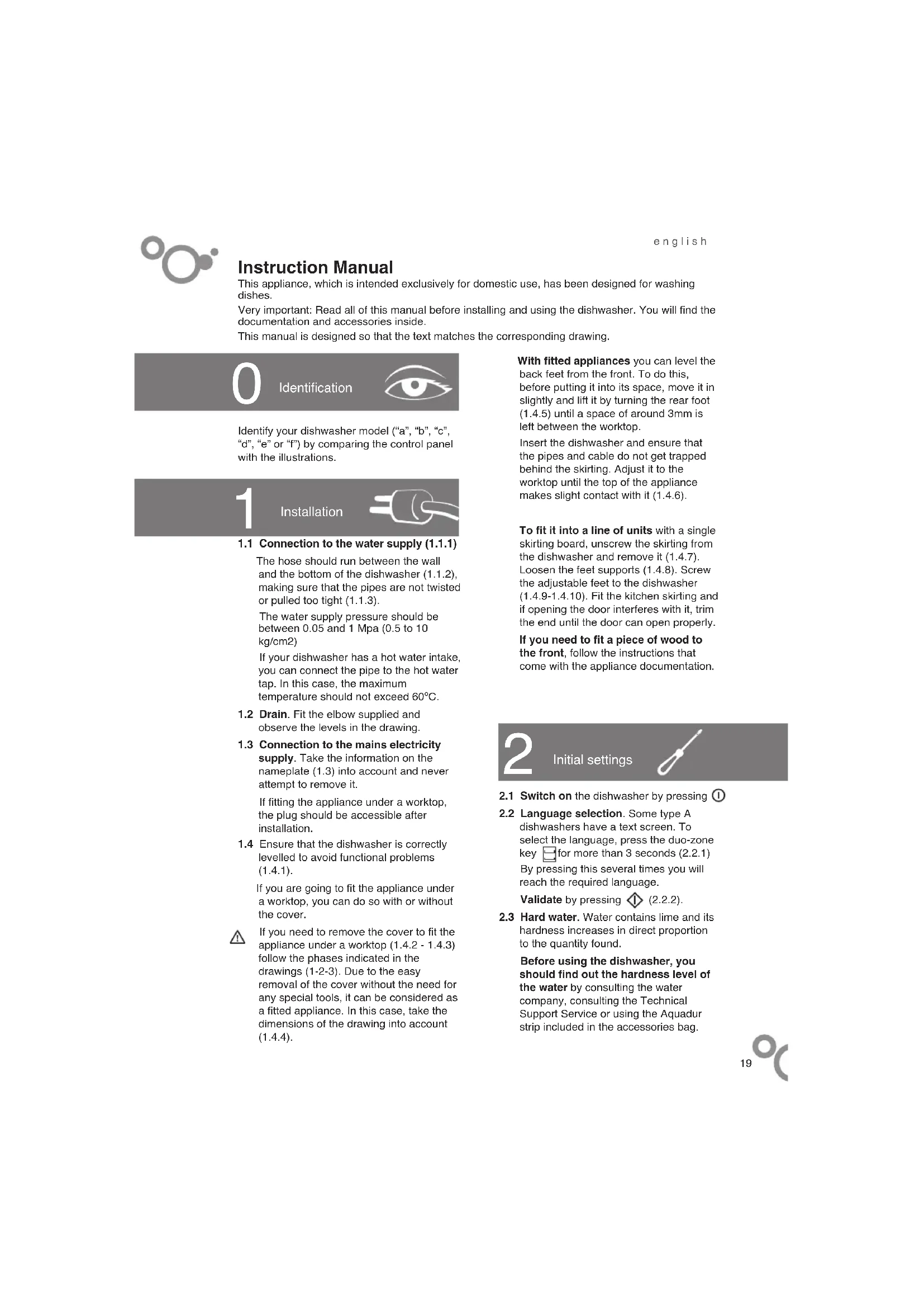 hardness increases in direct proportion to the quantity found. Before using the dishwasher, you should find out the hardness level of the water by consulting the water company, consulting the Technical Support Service or using the Aquadur strip included in the accessories bag.