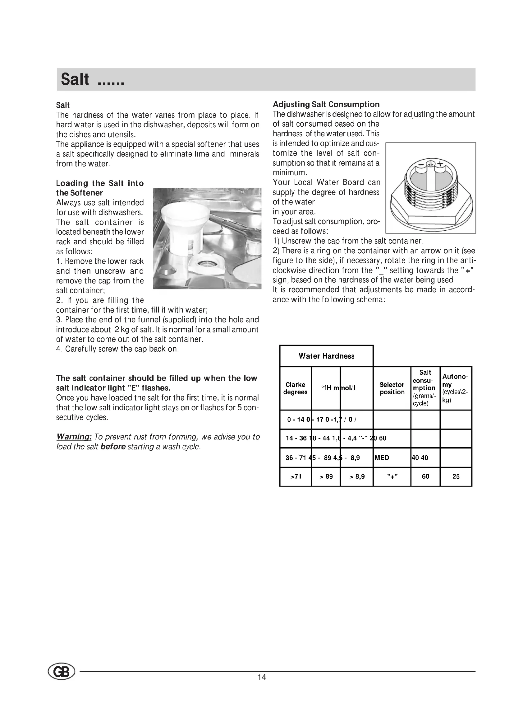load the salt before starting a wash cycle. Adjusting Salt Consumption The dishwasher is designed to allow for adjusting the amount of salt consumed based on the hardness of the water used. This is intended to optimize and cus- tomize the level of salt con- sumption so that it remains at a minimum. Your Local Water Board can supply the degree of hardness of the water in your area. To adjust salt consumption, pro- ceed as follows:
