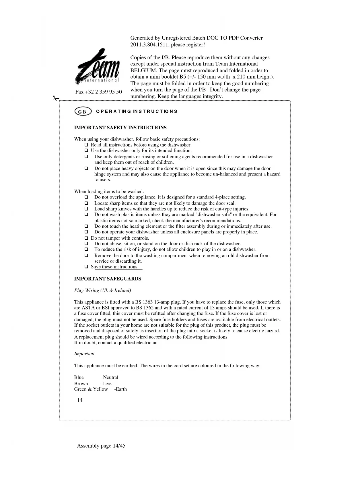 When using your dishwasher, follow basic safety precautions: Read all instructions before using the dishwasher. Use the dishwasher only for its intended function. Use only detergents or rinsing or softening agents recommended for use in a dishwasher and keep them out of reach of children. Do not place heavy objects on the door when it is open since this may damage the door hinge system and may also cause the appliance to become un-balanced and present a hazard to users. When loading items to be washed: Do not overload the appliance, it is designed for a standard 4-place setting. Locate sharp items so that they are not likely to damage the door seal. Load sharp knives with the handles up to reduce the risk of cut-type injuries. Do not wash plastic items unless they are marked "dishwasher safe" or the equivalent. For plastic items not so marked, check the manufacturer's recommendations. Do not touch the heating element or the filter assembly during or immediately after use. Do not operate your dishwasher unless all enclosure panels are properly in place. Do not tamper with controls. Do not abuse, sit on, or stand on the door or dish rack of the dishwasher. To reduce the risk of injury, do not allow children to play in or on a dishwasher. Remove the door to the washing compartment when removing an old dishwasher from service or discarding it. Save these instructions. IMPORTANT SAFEGUARDS Plug Wiring (Uk & Ireland) This appliance is fitted with a BS 1363 13-amp plug. If you have to replace the fuse, only those which are ASTA or BSI approved to BS 1362 and with a rated current of 13 amps should be used. If there is a fuse cover fitted, this cover must be refitted after changing the fuse. If the fuse cover is lost or damaged, the plug must not be used. Spare fuse holders and fuses are available from electrical outlets. If the socket outlets in your home are not suitable for the plug of this product, the plug must be removed and disposed of safely as insertion of the plug into a socket is likely to cause electric hazard. A replacement plug should be wired according to the following instructions. If in doubt, contact a qualified electrician. Important This appliance must be earthed. The wires in the cord set are coloured in the following way: Blue -Neutral Brown -Live Green & Yellow -EarthGenerated by Unregistered Batch DOC TO PDF Converter 2011.3.804.1511, please register! Copies of the I/B. Please reproduce them without any changes except under special instruction from Team International BELGIUM. The page must reproduced and folded in order to obtain a mini booklet B5 (+/- 150 mm width x 210 mm height). The page must be folded in order to keep the good numbering when you turn the page of the I/B . Don‟t change the page numbering. Keep the languages integrity.