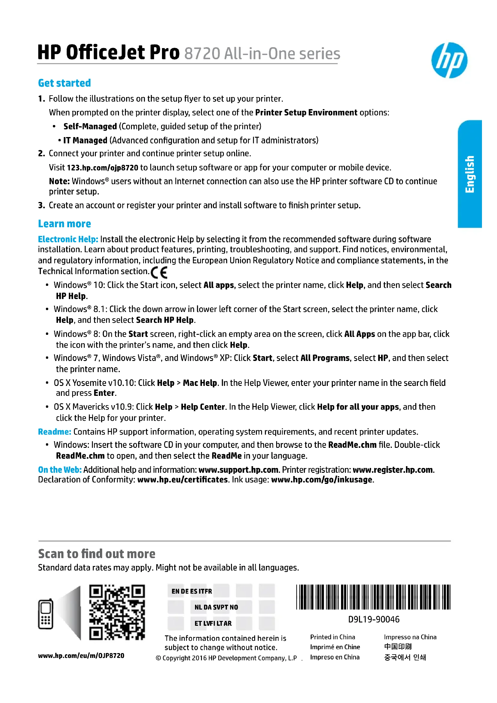 *D9L19-90046* *D9L19-90046* D9L19-90046Impresso na China중국에서 인쇄Printed in China Imprimé en ChineImpreso en ChinaEN DE ES ITFRNL DA SVPT NOET LVFI LT AR© Copyright 2016 HP Development Company, L.P The information contained herein is subject to change without notice. Scan to nd out more Standard data rates may apply. Might not be available in all languages.www.hp.com/eu/m/OJP8720 HP OiceJet Pro 8720 All-in-One series Get started1. Follow the illustrations on the setup yer to set up your printer. When prompted on the printer display, select one of the Printer Setup Environment options: