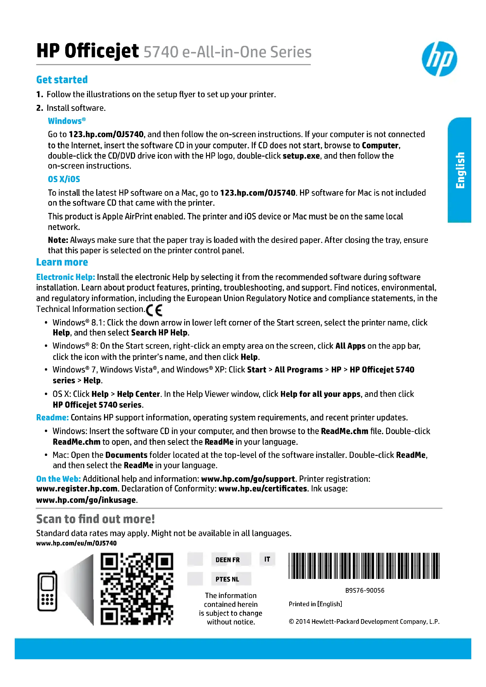Printed in [English] © 2014 Hewlett-Packard Development Company, L.P. *B9S76-90056* *B9S76-90056* B9S76-90056 English The information contained herein is subject to change without notice.www.hp.com/eu/m/OJ5740 Scan to nd out more! Standard data rates may apply. Might not be available in all languages.Learn more Electronic Help: Install the electronic Help by selecting it from the recommended software during software installation. Learn about product features, printing, troubleshooting, and support. Find notices, environmental, and regulatory information, including the European Union Regulatory Notice and compliance statements, in the Technical Information section.