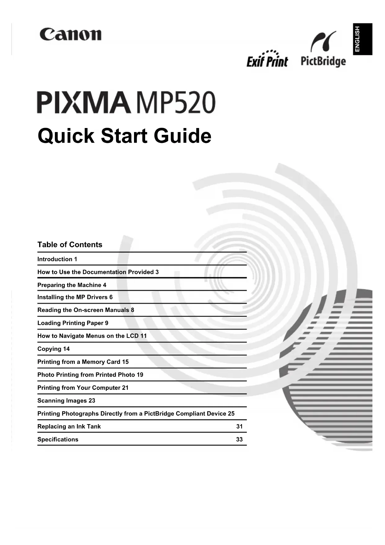 - The available software programs included on the Setup CD-ROM may vary depending on the country or region of purchase. z When the User Registration screen appears, click Next. If your computer is connected to the Internet, the on-screen instructions to register your product will appear. To register your product, you need the serial number inside of the machine. Registration can also be performed from the icon on the desktop after installation is completed. z The User Registration screen will only be displayed when Europe, Middle East, Africa is selected on the Select Your Place of Residence screen. Notes on the Print Head Alignment z If the straight line is misaligned or print quality is not satisfactory after installing the MP Drivers, you may need to align the Print Head. Refer to “Aligning the Print Head” in the User’s Guide on-screen manual. Information for Windows z Log into a user account with the administrator privilege. z Before installing the MP Drivers, disable all anti-virus programs and automatically loading programs. z If the Found New Hardware or Found New Hardware Wizard screen appears automatically, remove the USB cable connected to your computer. Click Cancel to quit the screen. In Windows Vista, the screen may close automatically when the USB cable is unplugged. Then turn off the machine and start the installation process again. For details on the installation process, refer to your setup sheet. z If the AutoPlay screen appears, click Run Msetup4.exe. In Windows XP and Windows 2000, this screen will not appear. z If the User Account Control screen appears, click Continue. In Windows XP and Windows 2000, this screen will not appear. z When a message asking for your confirmation to restart your computer appears during the installation process, click OK. The system is restarted automatically. While restarting, do not remove the Setup CD-ROM. z We would appreciate it if you would take part in the PIXMA Extended Survey Program regarding the use of Canon printers. For details, refer to the on-screen instructions. z If the connection is not recognized, refer to “Cannot Install the MP Drivers” in the User’s Guide on-screen manual. Users in Asia z Scan Soft OmniPage SE can be installed only on an English operating system. MP520_QSG_EN.book Page 6 Thursday, May 17, 2007 4:00 PM7Installing the MP Drivers ENGLISH Information for Macintosh z Since Mac OS 9, Mac OS X Classic environments, or Mac OS X v.10.2.7 or earlier are not supported, do not connect the machine to these. z Before installing the MP Drivers, disable all anti-virus programs and automatically loading programs or remove them from your system folder. When using Mac OS X v.10.2.8 to v.10.3.x: z Before using the Operation Panel on the machine to save originals scanned from the Platen Glass to the computer, it is necessary to select MP Navigator EX 1.0 or MP Navigator EX 1 as the launch application on Image Capture under Applications. For details, refer to “Scanning Images” in the User’s Guide on-screen manual. When using Mac OS X v.10.2.8 to v.10.3.3: z Restarting the computer while connected to the machine may cause the machine not to be detected. To resolve this, either unplug the USB cable then plug it back in again, or turn the machine off then back on again. Users in Asia z To install the User’s Guide on-screen manual in a language other than the installed one, double-click the Manual folder in the Setup CD-ROM, Canon folder, and then copy a language folder to your hard disk. MP520_QSG_EN.book Page 7 Thursday, May 17, 2007 4:00 PM8 Reading the On-screen Manuals ENGLISH Reading the On-screen Manuals For detailed instructions on installing the on-screen manuals, refer to your setup sheet. You can view the on-screen manuals in the following way: To view the on-screen manual, double-click the XXX On-screen Manual shortcut icon on the desktop, or click Start > All Programs (or Programs) > Canon XXX Manual > XXX On-screen Manual (where “XXX” is your machine’s name). System Requirements Browser: Windows HTML Help Viewer To view the on-screen manual, double-click the XXX On-screen Manual alias (where “XXX” is your machine’s name) on the desktop. System Requirements Browser: Help Viewer Note z Microsoft