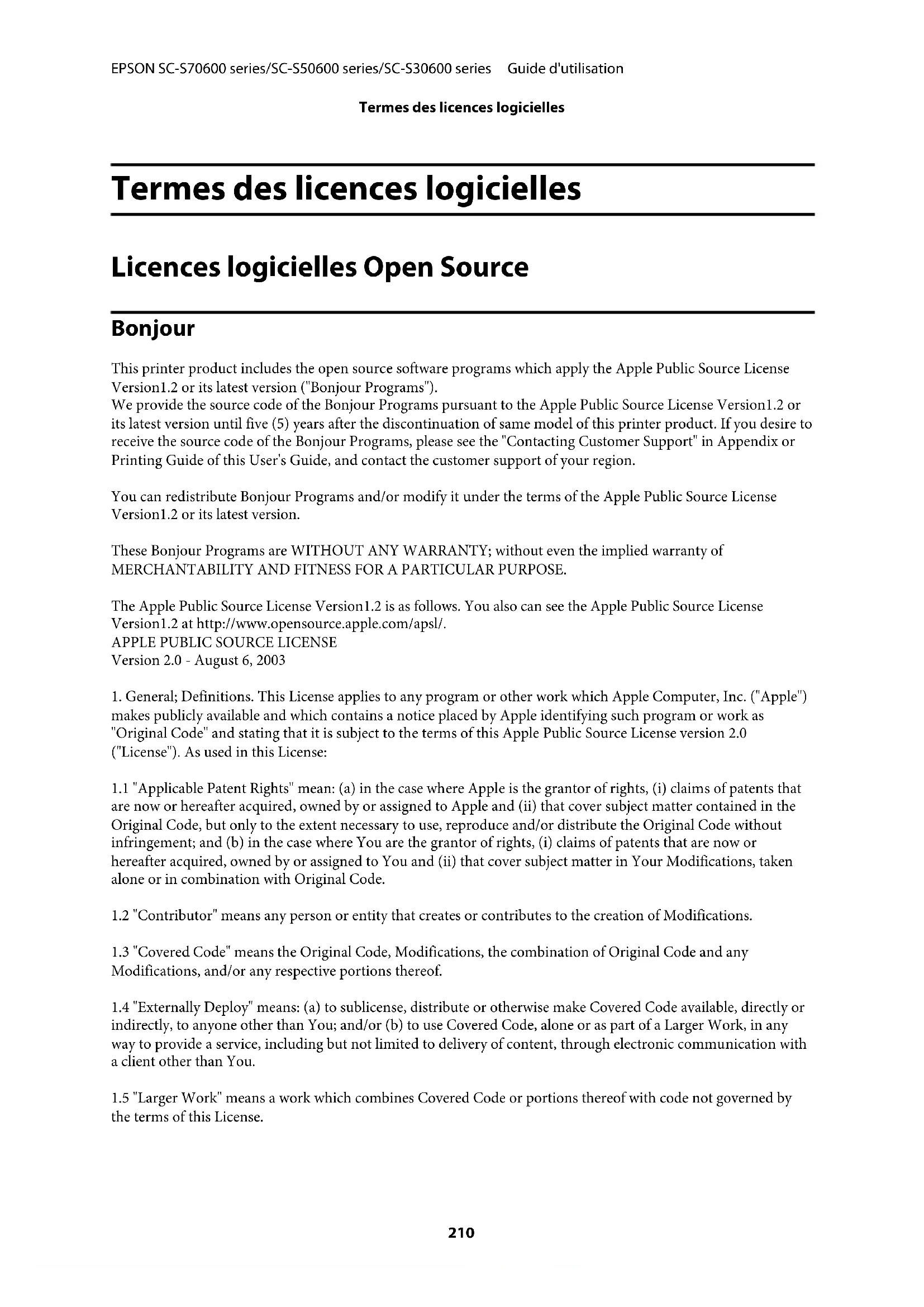version will be given a distinguishing version number. Once Original Code has been published under a particular version of this License, You may continue to use it under the terms of that version. You may also choose to use such Original Code under the terms of any subsequent version of this License published by Apple. No one other than Apple has the right to modify the terms applicable to Covered Code created under this License. EPSON SC-S70600 series/SC-S50600 series/SC-S30600 series Guide d'utilisation Termes des licences logicielles 2128. NO WARRANTY OR SUPPORT. The Covered Code may contain in whole or in part pre-release, untested, or not fully tested works. The Covered Code may contain errors that could cause failures or loss of data, and may be incomplete or contain inaccuracies. You expressly acknowledge and agree that use of the Covered Code, or any portion thereof, is at Your sole and entire risk. THE COVERED CODE IS PROVIDED "AS IS" AND WITHOUT WARRANTY, UPGRADES OR SUPPORT OF ANY KIND AND APPLE AND APPLE'S LICENSOR(S) (COLLECTIVELY REFERRED TO AS "APPLE" FOR THE PURPOSES OF SECTIONS 8 AND 9) AND ALL CONTRIBUTORS EXPRESSLY DISCLAIM ALL WARRANTIES AND/OR CONDITIONS, EXPRESS OR IMPLIED, INCLUDING, BUT NOT LIMITED TO, THE IMPLIED WARRANTIES AND/OR CONDITIONS OF MERCHANTABILITY, OF SATISFACTORY QUALITY, OF FITNESS FOR A PARTICULAR PURPOSE, OF ACCURACY, OF QUIET ENJOYMENT, AND NONINFRINGEMENT OF THIRD PARTY RIGHTS. APPLE AND EACH CONTRIBUTOR DOES NOT WARRANT AGAINST INTERFERENCE WITH YOUR ENJOYMENT OF THE COVERED CODE, THAT THE FUNCTIONS CONTAINED IN THE COVERED CODE WILL MEET YOUR REQUIREMENTS, THAT THE OPERATION OF THE COVERED CODE WILL BE UNINTERRUPTED OR ERROR-FREE, OR THAT DEFECTS IN THE COVERED CODE WILL BE CORRECTED. NO ORAL OR WRITTEN INFORMATION OR ADVICE GIVEN BY APPLE, AN APPLE AUTHORIZED REPRESENTATIVE OR ANY CONTRIBUTOR SHALL CREATE A WARRANTY. You acknowledge that the Covered Code is not intended for use in the operation of nuclear facilities, aircraft navigation, communication systems, or air traffic control machines in which case the failure of the Covered Code could lead to death, personal injury, or severe physical or environmental damage.