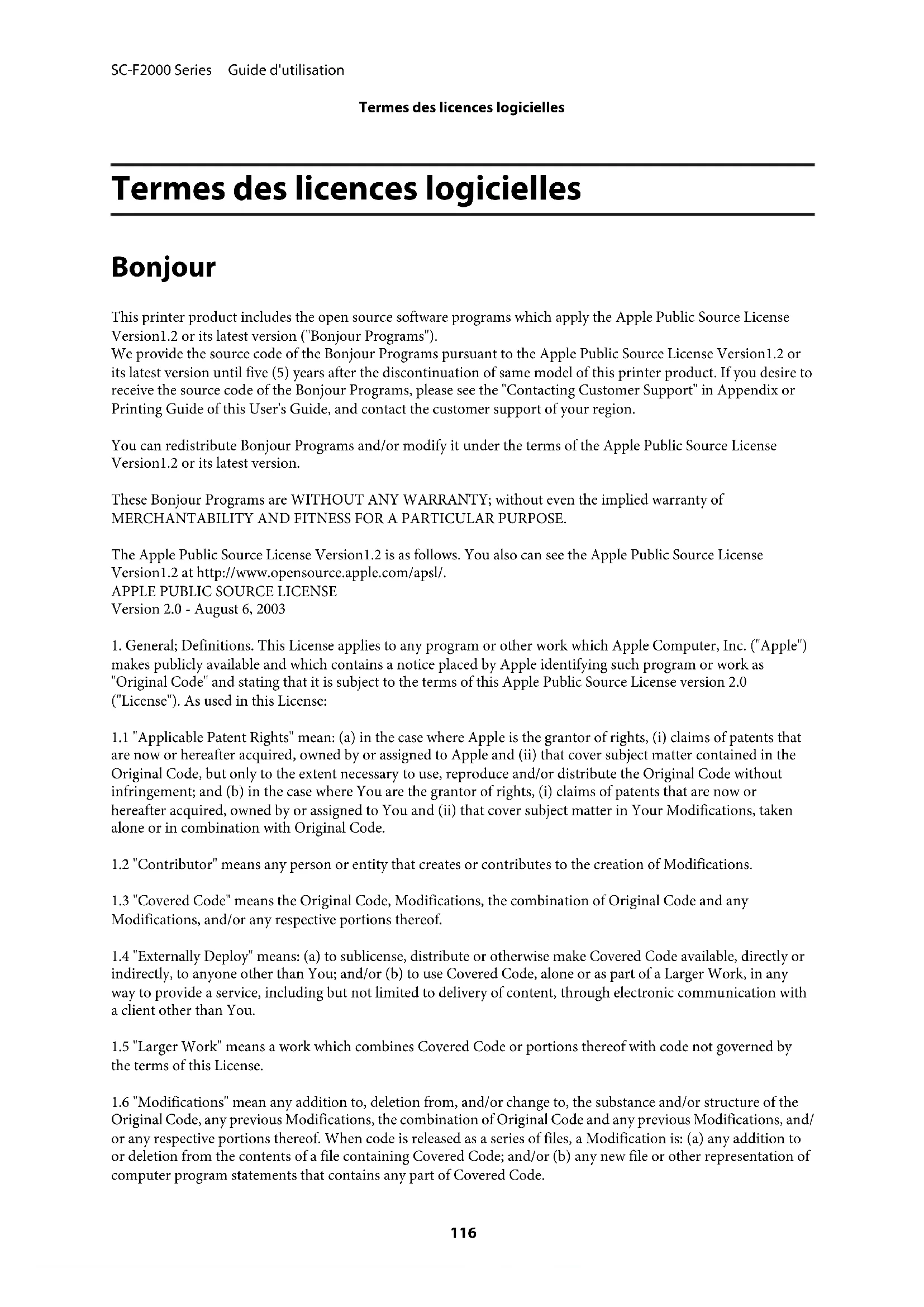 Original Code, any previous Modifications, the combination of Original Code and any previous Modifications, and/ or any respective portions thereof. When code is released as a series of files, a Modification is: (a) any addition to or deletion from the contents of a file containing Covered Code; and/or (b) any new file or other representation of computer program statements that contains any part of Covered Code. SC-F2000 Series Guide d'utilisation Termes des licences logicielles 1161.7 "Original Code" means (a) the Source Code of a program or other work as originally made available by Apple under this License, including the Source Code of any updates or upgrades to such programs or works made available by Apple under this License, and that has been expressly identified by Apple as such in the header file(s) of such work; and (b) the object code compiled from such Source Code and originally made available by Apple under this License