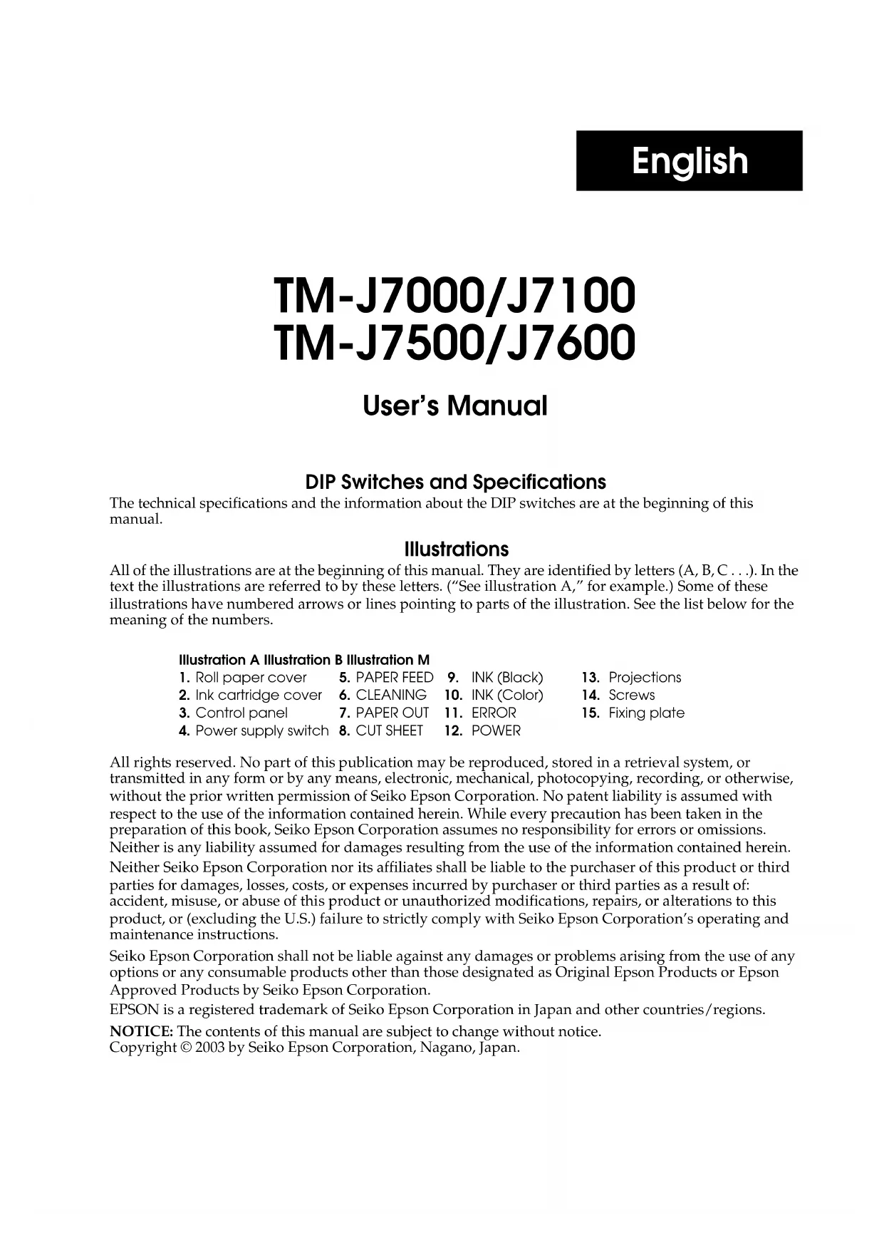 MEnglish TM-J7000/J7100 TM-J7500/J7600 User’s Manual DIP Switches and Specifications The technical specifications and the information about the DIP switches are at the beginning of this manual. Illustrations All of the illustrations are at the beginning of this manual. They are identified by letters (A, B, C ...). In the text the illustrations are referred to by these letters. (“See illustration A,” for example.) Some of these illustrations have numbered arrows or lines pointing to parts of the illustration. See the list below for the meaning of the numbers. All rights reserved. No part of this publication may be reproduced, stored in a retrieval system, or transmitted in any form or by any means, electronic, mechanical, photocopying, recording, or otherwise, without the prior written permission of Seiko Epson Corporation. No patent liability is assumed with respect to the use of the information contained herein. While every precaution has been taken in the preparation of this book, Seiko Epson Corporation assumes no responsibility for errors or omissions. Neither is any liability assumed for damages resulting from the use of the information contained herein. Neither Seiko Epson Corporation nor its affiliates shall be liable to the purchaser of this product or third parties for damages, losses, costs, or expenses incurred by purchaser or third parties as a result of: accident, misuse, or abuse of this product or unauthorized modifications, repairs, or alterations to this product, or (excluding the U.S.) failure to strictly comply with Seiko Epson Corporation’s operating and maintenance instructions. Seiko Epson Corporation shall not be liable against any damages or problems arising from the use of any options or any consumable products other than those designated as Original Epson Products or Epson Approved Products by Seiko Epson Corporation. EPSON is a registered trademark of Seiko Epson Corporation in Japan and other countries/regions. NOTICE: The contents of this manual are subject to change without notice. Copyright © 2003 by Seiko Epson Corporation, Nagano, Japan. Illustration A Illustration B Illustration M