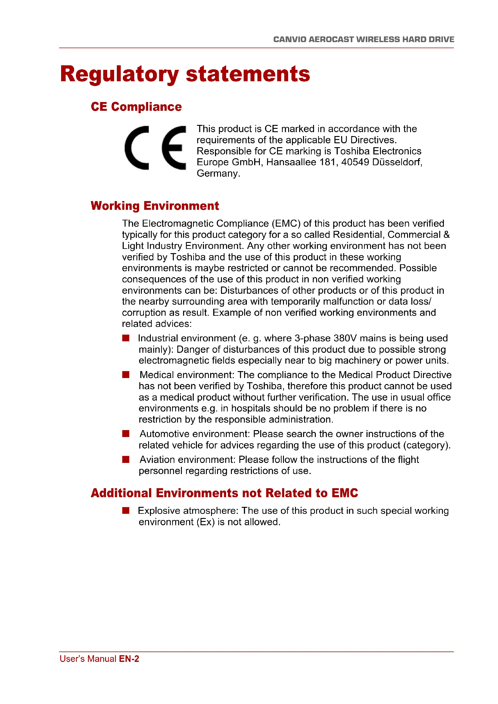 User’s Manual Regulatory statements CE Compliance Working Environment The Electromagnetic Compliance (EMC) of this product has been verified typically for this product category for a so called Residential, Commercial & Light Industry Environment. Any other working environment has not been verified by Toshiba and the use of this product in these working environments is maybe restricted or cannot be recommended. Possible consequences of the use of this product in non verified working environments can be: Disturbances of other products or of this product in the nearby surrounding area with temporarily malfunction or data loss/ corruption as result. Example of non verified working environments and related advices: ■ Industrial environment (e. g. where 3-phase 380V mains is being used mainly): Danger of disturbances of this product due to possible strong electromagnetic fields especially near to big machinery or power units. ■ Medical environment: The compliance to the Medical Product Directive has not been verified by Toshiba, therefore this product cannot be used as a medical product without further verification. The use in usual office environments e.g. in hospitals should be no problem if there is no restriction by the responsible administration. ■ Automotive environment: Please search the owner instructions of the related vehicle for advices regarding the use of this product (category). ■ Aviation environment: Please follow the instructions of the flight personnel regarding restrictions of use. Additional Environments not Related to EMC ■ Explosive atmosphere: The use of this product in such special working environment (Ex) is not allowed. This product is CE marked in accordance with the requirements of the applicable EU Directives. Responsible for CE marking is Toshiba Electronics Europe GmbH, Hansaallee 181, 40549 Düsseldorf, Germany.User’s Manual EN-3