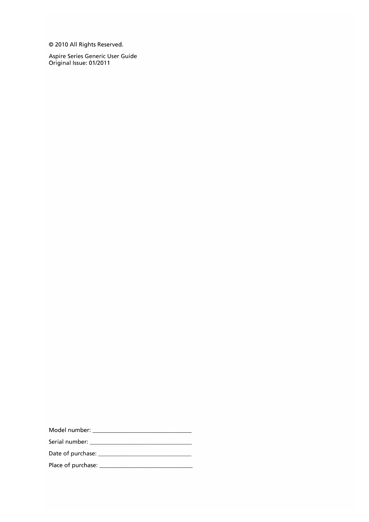 Bahasa Indonesia ä·Â ContentsAspire Series Generic User GuideChanges may be made periodically to the information in this publication without obligation to notify any person of such revisions or changes. Such changes will be incorporated in new editions of this manual or supplementary documents and publications. This company makes no representations or warranties, either expressed or implied, with respect to the contents hereof and specifically disclaims the implied warranties of merchantability or fitness for a particular purpose. Record the model number, serial number, purchase date and place of purchase information in the space provided below. The serial number and model number are recorded on the label affixed to your computer. All correspondence concerning your unit should include the serial number, model number and purchase information. No part of this publication may be reproduced, stored in a retrieval system, or transmitted, in any form or by any means, electronically, mechanically, by photocopy, recording or otherwise, without the prior written permission of Acer Incorporated. Model number: __________________________________ Serial number: ___________________________________ Date of purchase: ________________________________ Place of purchase: ________________________________ © 2010 All Rights Reserved. Aspire Series Generic User Guide Original Issue: 01/2011iii English Information for your safety and comfort Safety instructions Read these instructions carefully. Keep this document for future reference. Follow all warnings and instructions marked on the product. Turning the product off before cleaning Unplug this product from the wall outlet before cleaning. Do not use liquid cleaners or aerosol cleaners. Use a damp cloth for cleaning. CAUTION for plug as disconnecting device Observe the following guidelines when connecting and disconnecting power to the power supply unit: Install the power supply unit before connecting the power cord to the AC power outlet. Unplug the power cord before removing the power supply unit from the computer. If the system has multiple sources of power, disconnect power from the system by unplugging all power cords from the power supplies. CAUTION for Accessibility Be sure that the power outlet you plug the power cord into is easily accessible and located as close to the equipment operator as possible. When you need to disconnect power to the equipment, be sure to unplug the power cord from the electrical outlet. CAUTION for bundled dummy cards (only for certain models) Your computer shipped with plastic dummies installed in the card slots. Dummies protect unused slots from dust, metal objects or other particles. Save the dummies for use when no cards are in the slots. CAUTION for Listening To protect your hearing, follow these instructions.