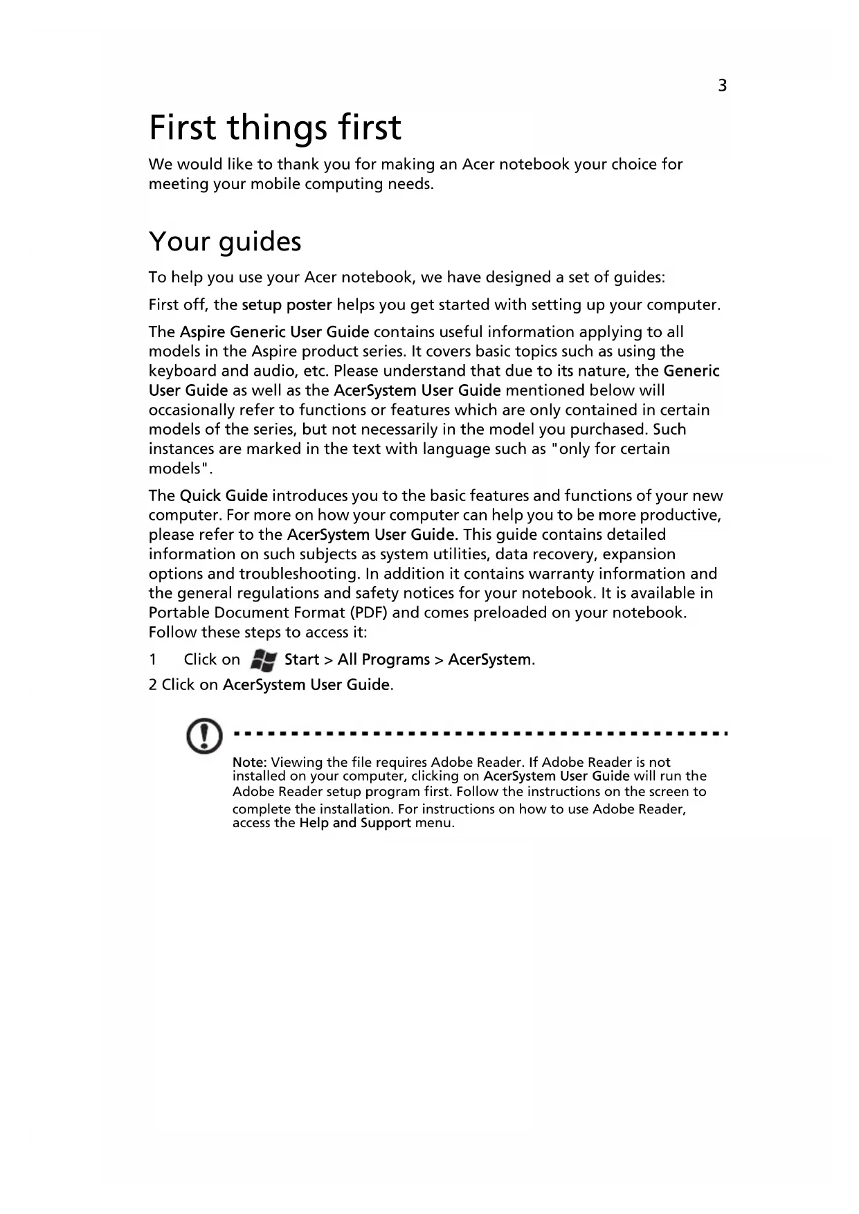 Bahasa Indonesia ä·Â ContentsAspire Notebook Series Quick GuideModel number: __________________________________ Serial number: ___________________________________ Date of purchase: ________________________________ Place of purchase: ________________________________ © 2010. All Rights Reserved. Aspire Notebook Series Quick Guide Original Issue: 07/20103 First things first We would like to thank you for making an Acer notebook your choice for meeting your mobile computing needs. Your guides To help you use your Acer notebook, we have designed a set of guides: First off, the setup poster helps you get started with setting up your computer. The Aspire Generic User Guide contains useful information applying to all models in the Aspire product series. It covers basic topics such as using the keyboard and audio, etc. Please understand that due to its nature, the Generic User Guide as well as the AcerSystem User Guide mentioned below will occasionally refer to functions or features which are only contained in certain models of the series, but not necessarily in the model you purchased. Such instances are marked in the text with language such as "only for certain models". The Quick Guide introduces you to the basic features and functions of your new computer. For more on how your computer can help you to be more productive, please refer to the AcerSystem User Guide. This guide contains detailed information on such subjects as system utilities, data recovery, expansion options and troubleshooting. In addition it contains warranty information and the general regulations and safety notices for your notebook. It is available in Portable Document Format (PDF) and comes preloaded on your notebook. Follow these steps to access it: 1 Click on Start > All Programs > AcerSystem. 2 Click on AcerSystem User Guide. Note: Viewing the file requires Adobe Reader. If Adobe Reader is not installed on your computer, clicking on AcerSystem User Guide will run the Adobe Reader setup program first. Follow the instructions on the screen to complete the installation. For instructions on how to use Adobe Reader, access the Help and Support menu.4 English Your Acer notebook tour After setting up your computer as illustrated in the setup poster, let us show you around your new Acer notebook. Top view # Icon Item Description1 Integrated webcamWeb camera for video communication(only for certain models).