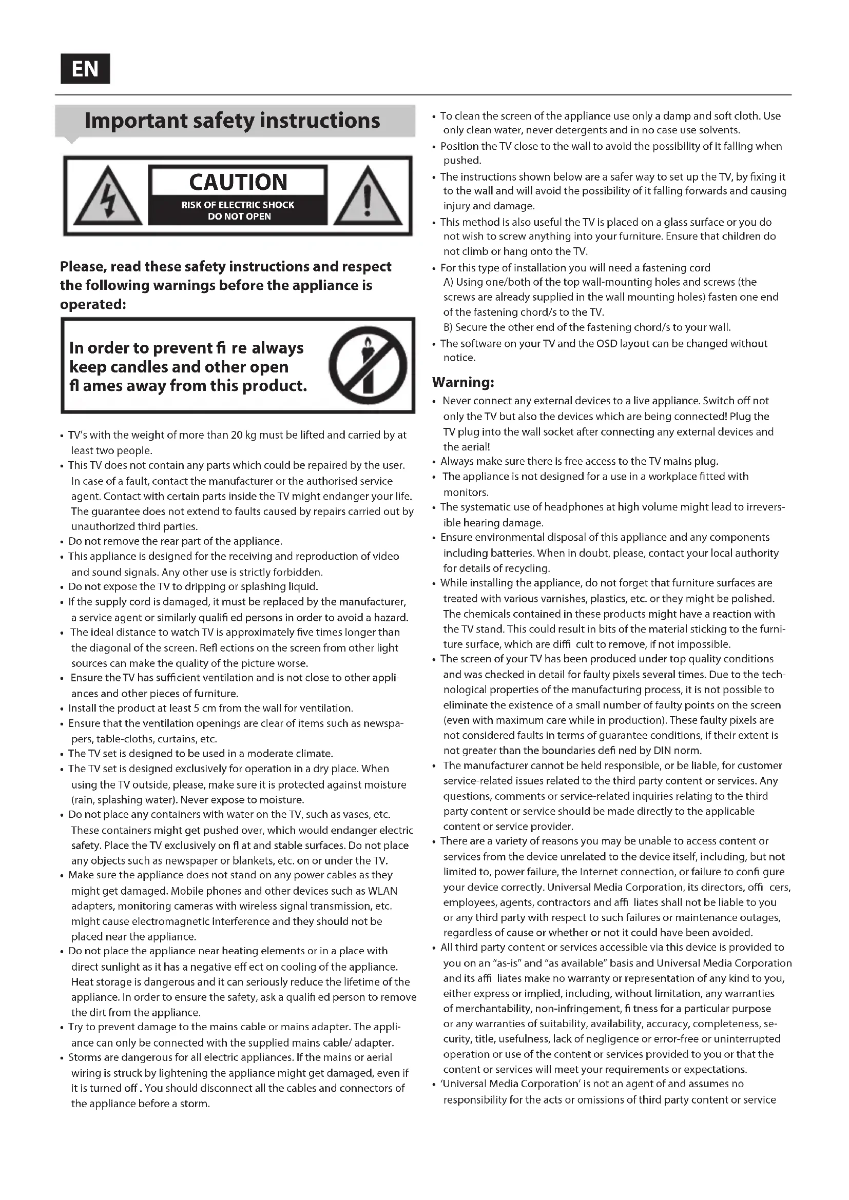 - The appliance is not designed for ause in aworkplace tted with monitors.• The systematic use of headphones at high volume might lead to irrevers-ible hearing damage.• Ensure environmental disposal of this appliance and any components including batteries. When in doubt, please, contact your local authority for details of recycling.• While installing the appliance, do not forget that furniture surfaces are treated with various varnishes, plastics, etc. or they might be polished. The chemicals contained in these products might have areaction with the TV stand. This could result in bits of the material sticking to the furni-ture surface, which are di cult to remove, if not impossible.• The screen of your TV has been produced under top quality conditions and was checked in detail for faulty pixels several times. Due to the tech-nological properties of the manufacturing process, it is not possible to eliminate the existence of asmall number of faulty points on the screen (even with maximum care while in production). These faulty pixels are not considered faults in terms of guarantee conditions, if their extent is not greater than the boundaries de ned by DIN norm. The manufacturer cannot be held responsible, or be liable, for customer service-related issues related to the third party content or services. Any questions, comments or service-related inquiries relating to the third party content or service should be made directly to the applicable content or service provider.• There are a variety of reasons you may be unable to access content or services from the device unrelated to the device itself, including, but not limited to, power failure, the Internet connection, or failure to con gure your device correctly. Universal Media Corporation, its directors, o cers, employees, agents, contractors and a liates shall not be liable to you or any third party with respect to such failures or maintenance outages, regardless of cause or whether or not it could have been avoided.• All third party content or services accessible via this device is provided to you on an “as-is” and “as available” basis and Universal Media Corporation and its a liates make no warranty or representation of any kind to you, either express or implied, including, without limitation, any warranties of merchantability, non-infringement, tness for a particular purpose or any warranties of suitability, availability, accuracy, completeness, se-curity, title, usefulness, lack of negligence or error-free or uninterrupted operation or use of the content or services provided to you or that the content or services will meet your requirements or expectations.• ‘Universal Media Corporation’ is not an agent of and assumes no responsibility for the acts or omissions of third party content or service5 providers, nor any aspect of the content or service related to such third party providers.